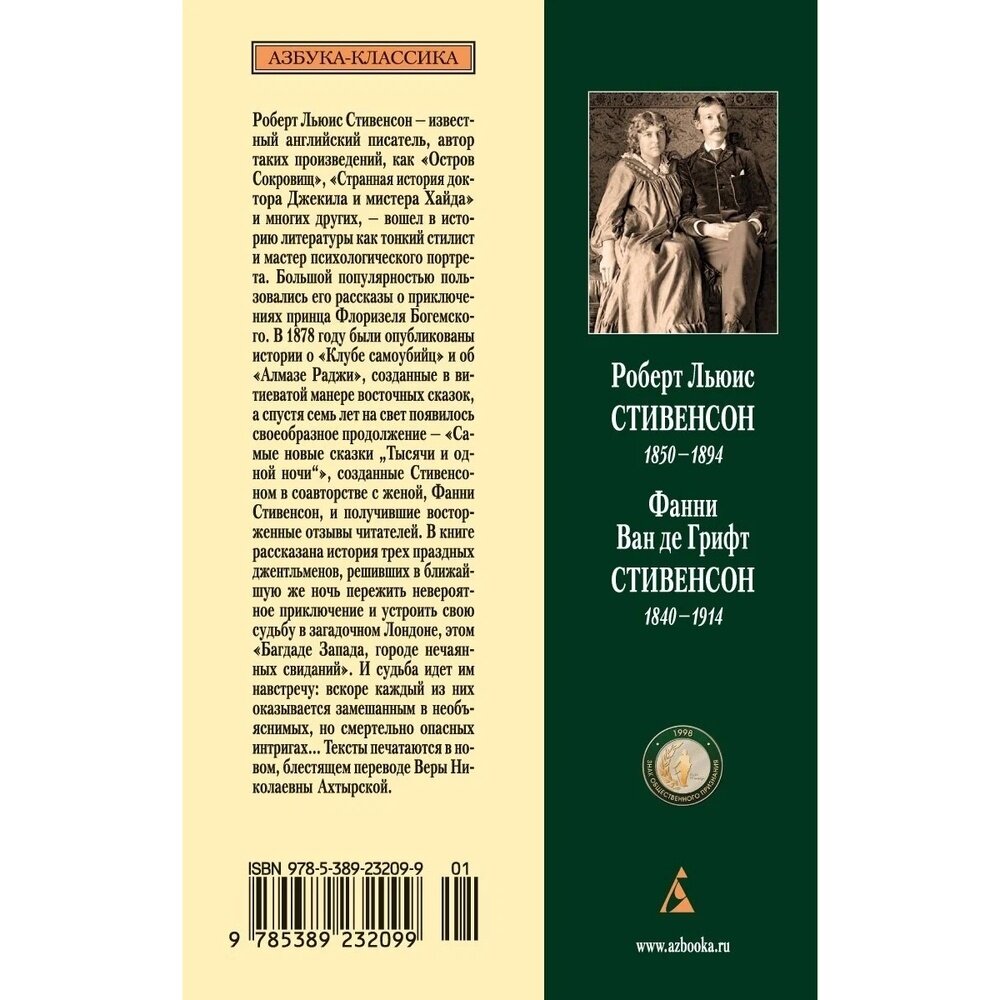 Роберт Льюис Стивенсон — известный английский писатель, автор таких произведений, как «Остров сокровищ», «Странная история доктора Джекила и мистера Хайда» и многих других, — вошел в историю литературы как тонкий стилист и мастер психологического портрета. Большой популярностью пользовались его рассказы о приключениях принца Флоризеля Богемского. В 1878 году были опубликованы истории о «Клубе самоубийц» и об «Алмазе Раджи», созданные в витиеватой манере восточных сказок, а спустя семь лет на свет появилось своеобразное продолжение — «Самые новые сказки „Тысячи и одной ночи“», созданные Стивенсоном в соавторстве с женой, Фанни Стивенсон, и получившие восторженные отзывы читателей. В книге рассказана история трех праздных джентльменов, решивших в ближайшую же ночь пережить невероятное приключение и устроить свою судьбу в загадочном Лондоне, этом «Багдаде Запада, городе нечаянных свиданий». И судьба идет им навстречу: вскоре каждый из них оказывается замешанным в необъяснимых, но смертельно опасных интригах… Тексты печатаются в новом, блестящем переводе Веры Николаевны Ахтырской.