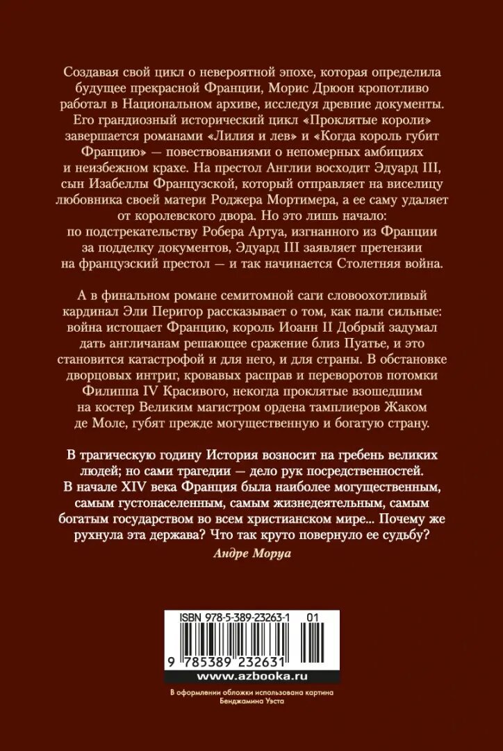 Создавая свой цикл о невероятной эпохе, которая определила будущее прекрасной Франции, Морис Дрюон кропотливо работал в Национальном архиве, исследуя древние документы. Его грандиозный исторический цикл "Проклятые короли" завершается романами "Лилия и лев" и "Когда король губит Францию" - повествованиями о непомерных амбициях и неизбежном крахе.