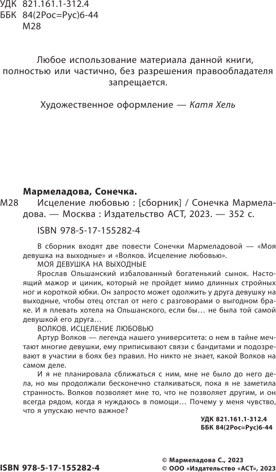 В сборник входят две повести Сонечки Мармеладовой - "Моя девушка на выходные" и "Волков. Исцеление любовью".