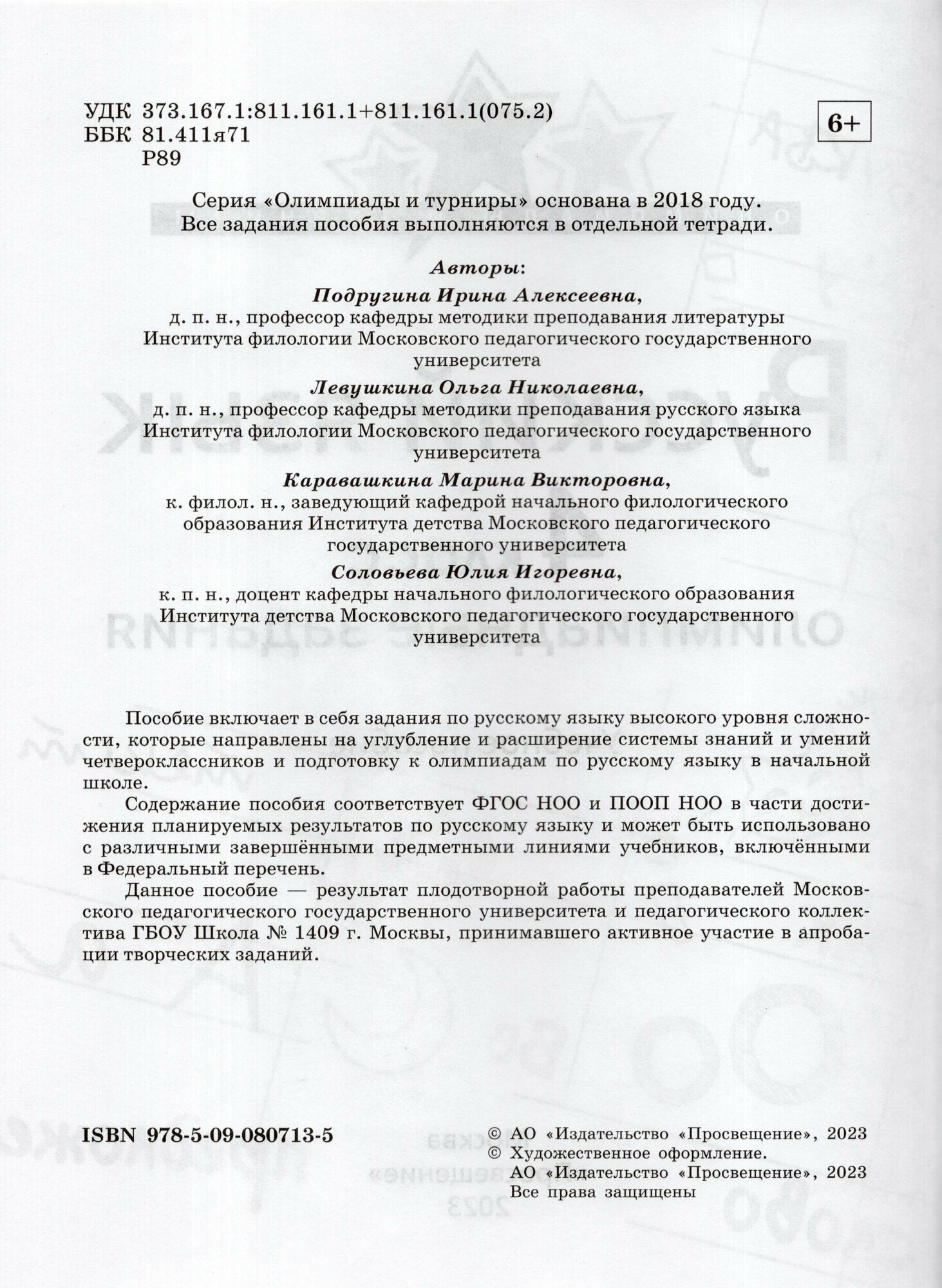 Русский язык. 4 класс. Олимпиадные задания (Ольга Николаевна Лёвушкина, Ирина Алексеевна Подругина, Марина Викторовна Каравашкина); Просвещение, 2024