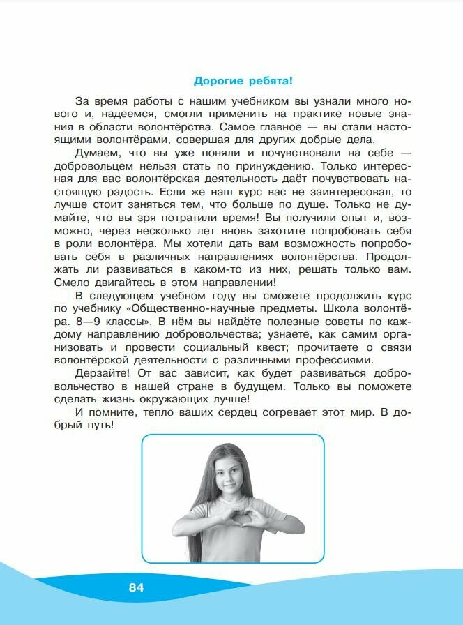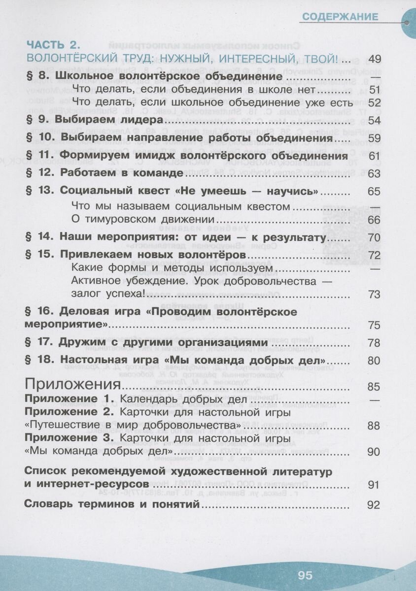 Учебник знакомит учащихся с миром волонтёрства, основными направлениями и принципами, на которых оно основывается, поможет преодолеть трудности с вступлением в добровольческую организацию и совершить много добрых дел, став настоящими волонтёрами. Тематические настольные игры и социальный квест, представленные в учебнике, помогут учащимся освоить и применить на практике полученные новые знания о добровольческой деятельности.
