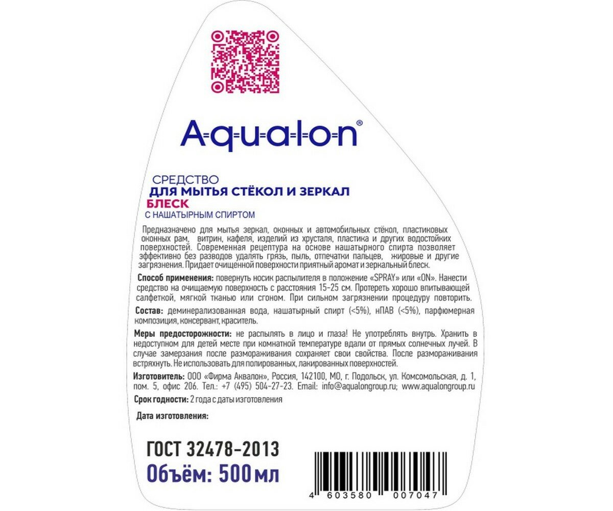 Средство чистящее Aqualon Блеск для мытья стекол и зеркал 500мл Аквалон
