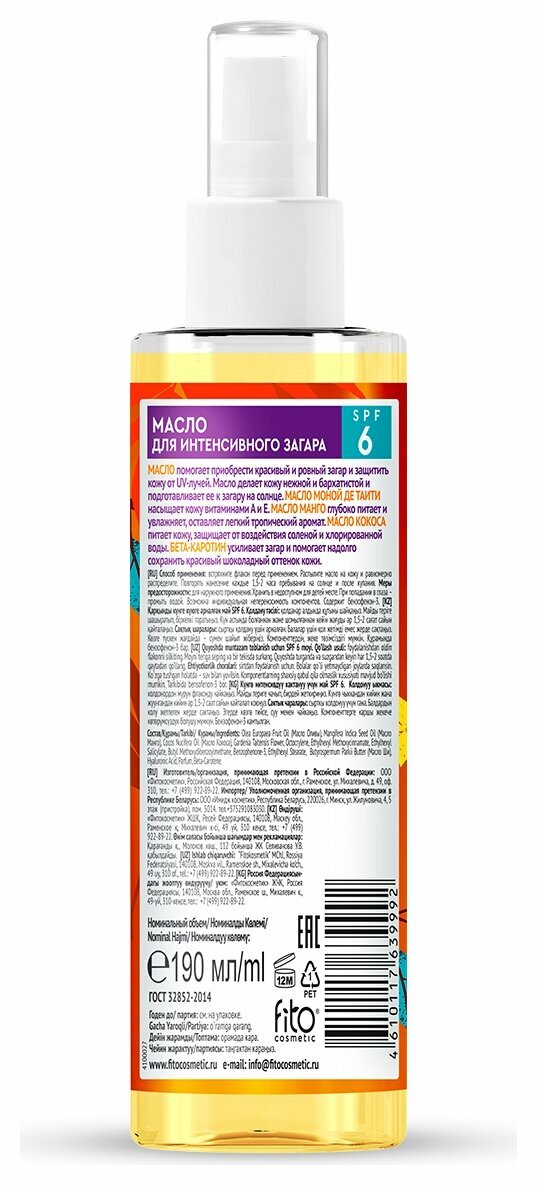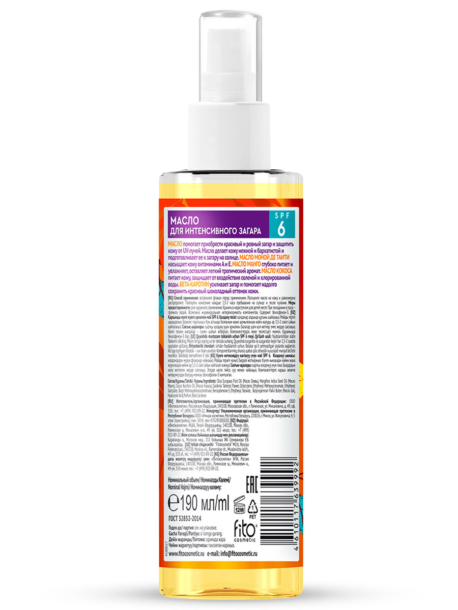 На сегодняшний день товар «Масло-спрей для загара Bio Cosmetolog Professional SPF 6 190мл ФИТОКОСМЕТИК» можно купить с кешбеком в 1 магазине: Яндекс.Маркет