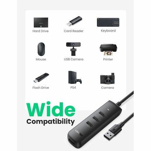 Ugreen – Китайская компания, которая была основана в 2009 г. Основная продукция – кабели, разветвители, адаптеры для подключения аудио и видеооборудования. Сотрудники компании тщательно следят за отзывами в адрес своей продукции и работы, оперативно совершенствуют качество товара. Продукция компании соответствует стандарту RoHS, который ограничивает содержание вредных веществ в составе электронного оборудования. Тонкий USB-C хаб устраняет несовместимость между устройствами, использующими интерфейсы USB-C, и позволяет подключать старые устройства к новому ноутбуку с интерфейсом USB-C, до 4-х стандартных USB 3.0 портов. USB-C хаб - концентратор данных с 4 портами поддерживает сверхбыструю передачу данных до 5 Гбит/с, что в 10 раз быстрее, чем при использовании USB 2.0 (480 Мбит/с). Это позволяет передавать HD фильмы или большие файлы всего за несколько секунд. Благодаря световому индикатору, расположенному на верхней панели устройства, Вы всегда сможете узнать статус соединения. Дополнительный разъем Type-C является обязательным для устройств с высокой мощностью. Подключение Plug-and-Play. Крепкий корпус из пожаробезопасного ABS-пластика. Длина кабеля 1 метр. Поддержка жесткого диска 12 ТБ.