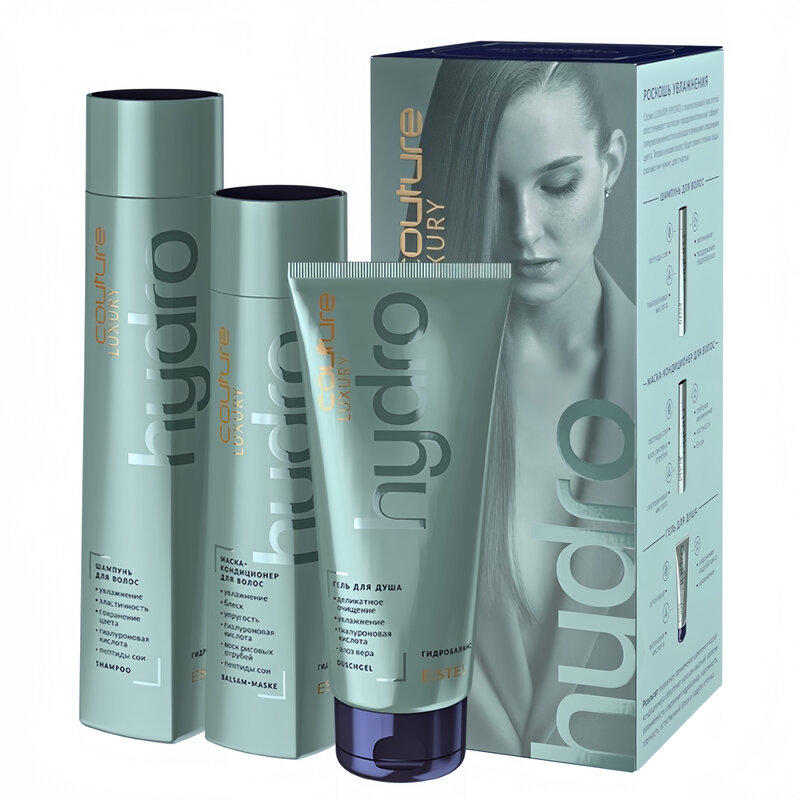 Серия LUXURY HYDRO с гиалуроновой кислотой обеспечивает волосам продолжительный эффект гиперувлажнённости и обладает функцией сохранения цвета. Теперь у ваших волос будет ровно столько воды, сколько им нужно для счастья.Состав набора:C/HB/S300 Шампунь для волос LUXURY HYDROBALANCE ESTEL HAUTE COUTURE (300 мл)C/HB/M250 Маска-кондиционер для волос LUXURY HYDROBALANCE ESTEL HAUTE COUTURE (250 мл)C/HB/G200 Гель для душа LUXURY HYDROBALANCE ESTEL HAUTE COUTURE (200 мл)