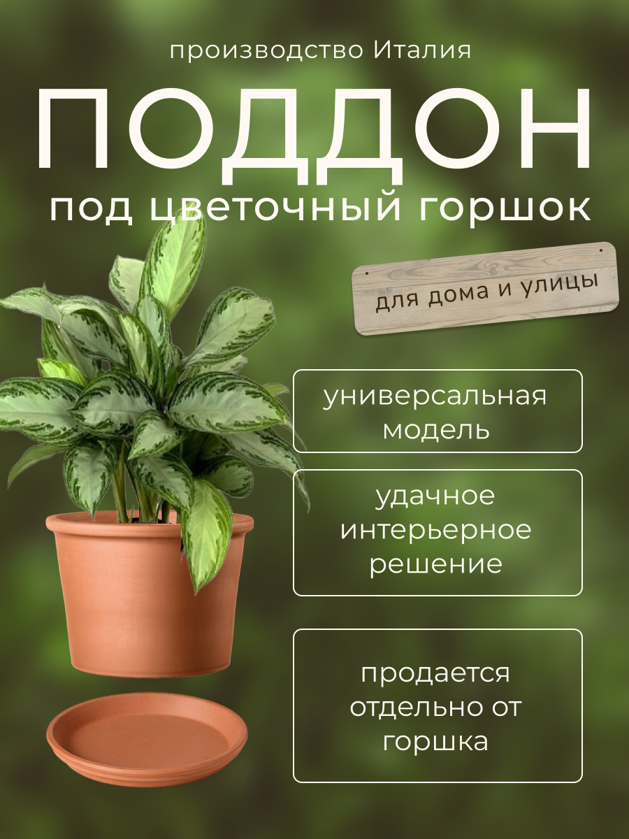 **Поддон Deroma Idrorepellente** предназначен для цветочных горшков. Собирает избыток влаги, поступающий из емкости через дренажное отверстие. Изготовлен из натуральной глины.