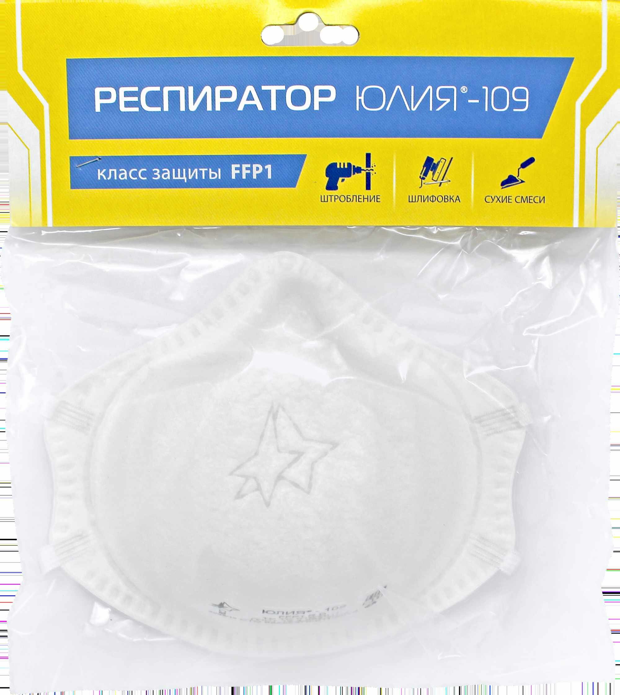 **Респиратор Юлия-109** защитит от пылевой взвеси, которая возникает во время ремонтных и строительных работ. Формованное одноразовое изделие имеет коэффициент полезного действия до 4 ПДК. Не содержит встроенный клапан. Выполнено из полипропилена белого цвета. Фильтрующий элемент обеспечивает класс защиты органов дыхания по стандарту FFP1.