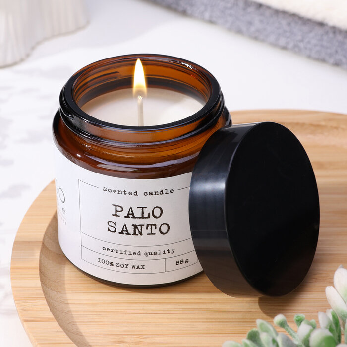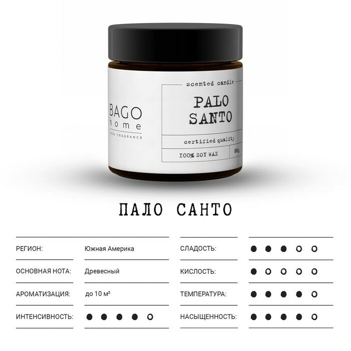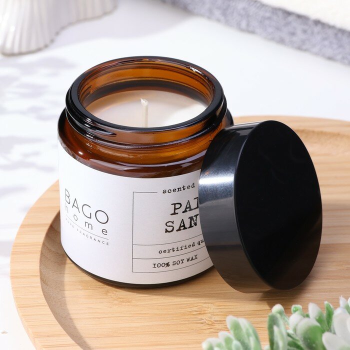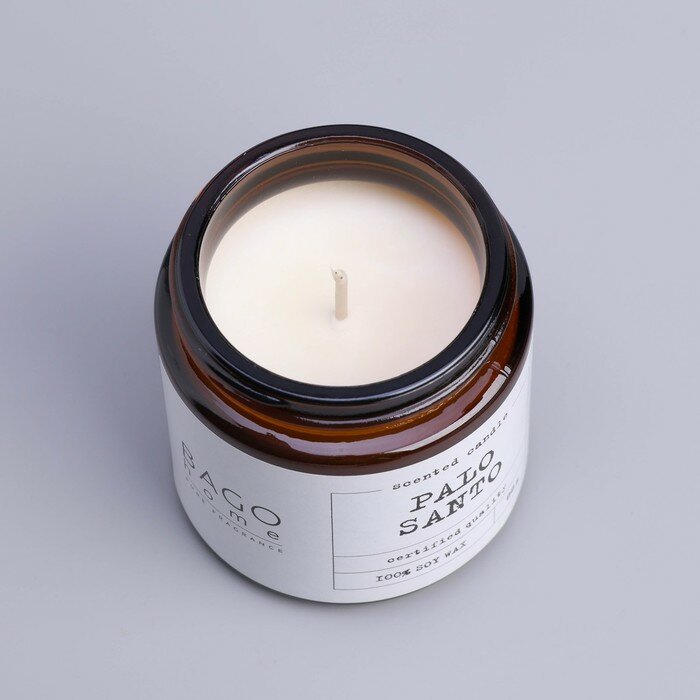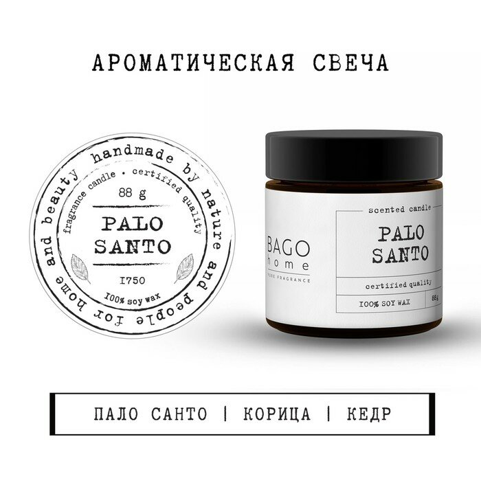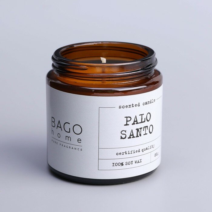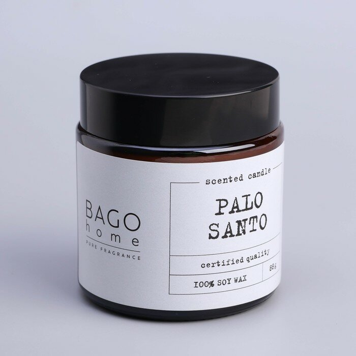 **Ароматическая свеча Bago Home «Пало санто»** — свеча в банке. Предназначена для ароматизации пространства и создания романтической, расслабляющей или праздничной обстановки. Зажженная свеча с древесным ароматом наполнит помещение изысканным, ненавязчивым благоуханием интерьерного парфюма. Изготовлена в природном стиле. Материал — воск, цвет — коричневый.