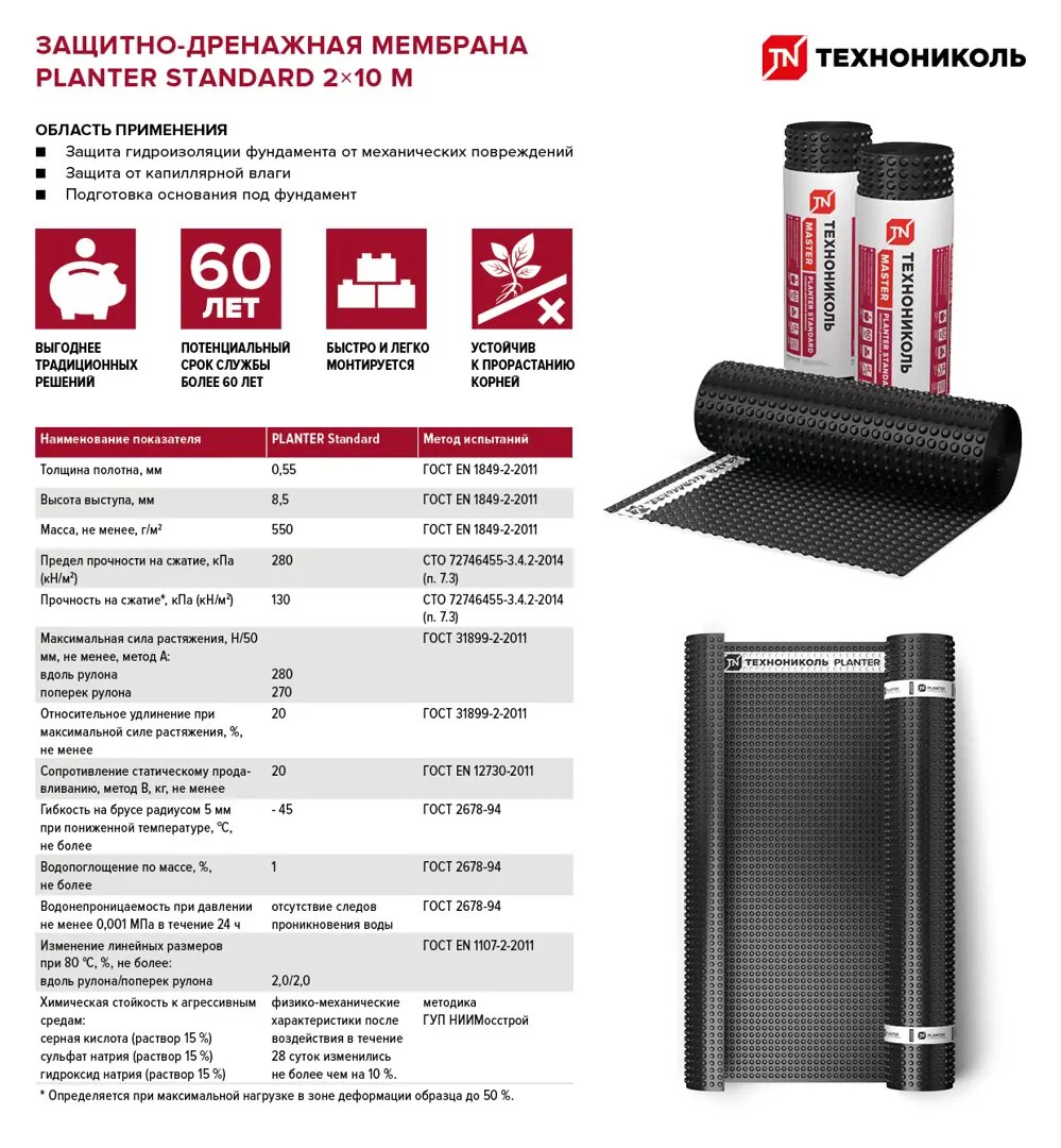 **Защитно-дренажная мембрана Технониколь Planter Standard** — профилированное полотно, изготовленное из полиэтилена высокой плотности. На поверхности находятся конусообразные выступы высотой 8,5 мм. Используется для защиты фундаментов от капиллярной влаги и прямого контакта с водой.