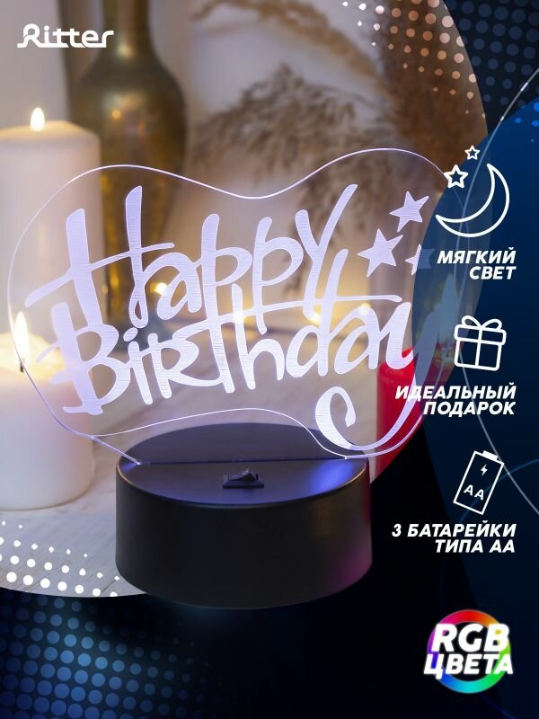 На сегодняшний день товар «Ночник Ritter Happy Birthday на батарейках 29252 4» можно купить с кешбеком в 1 магазине: Яндекс.Маркет