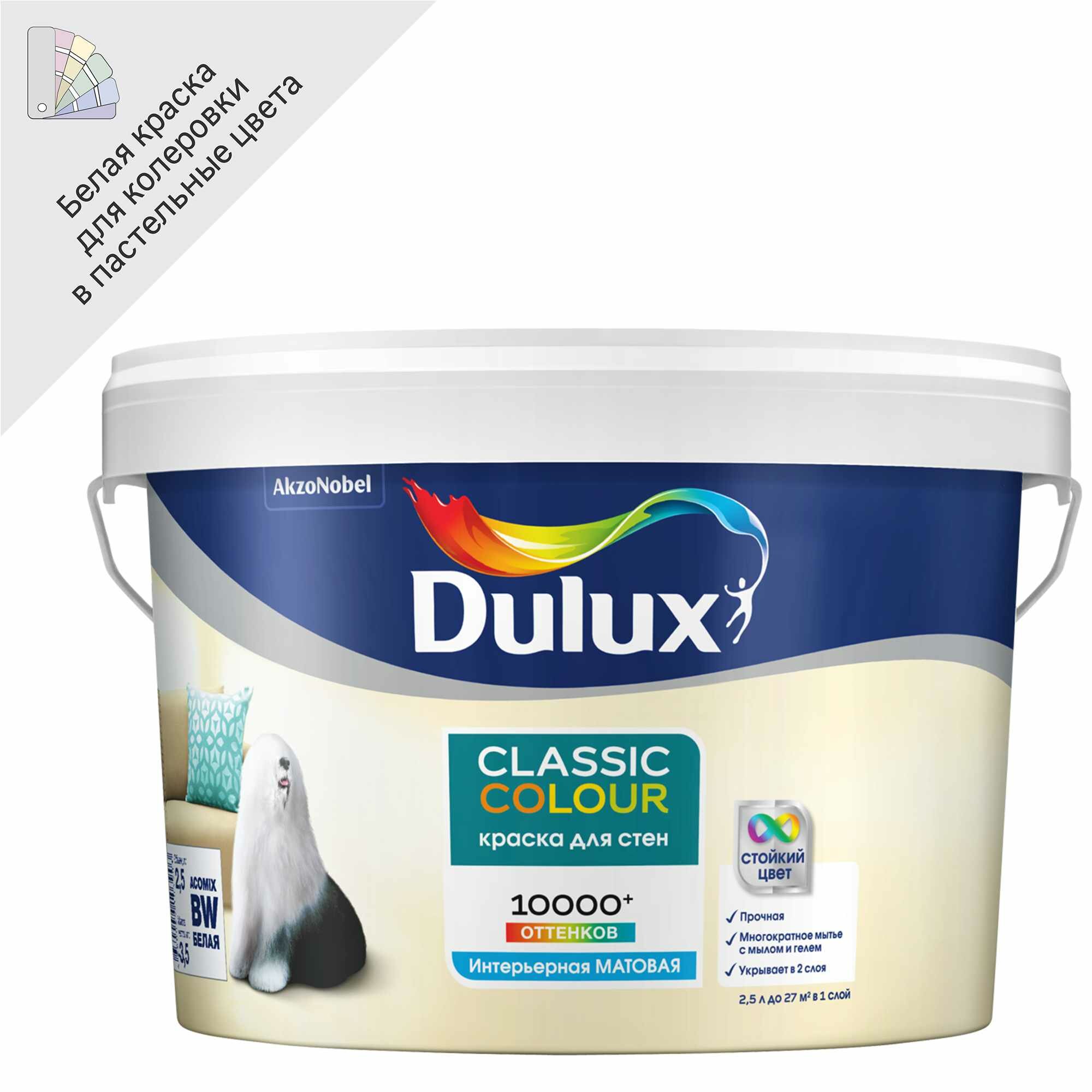 **Краска для стен и потолков Dulux Classic Colour 2.5л** образует гладкое прочное покрытие, стойкое к многократному мытью. Позволяет визуально скрыть небольшие дефекты поверхности. Не изменяет цвет с течением времени, надолго сохраняет яркость и насыщенность. Не имеет резкого запаха, обладает отличной укрывистостью, экономично расходуется, легко наносится без разбрызгивания и потеков. Подходит для окраски стен и потолков в помещениях с умеренной влажностью и повышенной эксплуатационной нагрузкой. Наносится на полностью просохшие и гладкие минеральные поверхности (бетон, штукатурка, кирпич и т.п), гипсокартон, обои под покраску, деревянные поверхности, ДВП. Заявленные свойства краски зависят от выбранного типа обоев.
