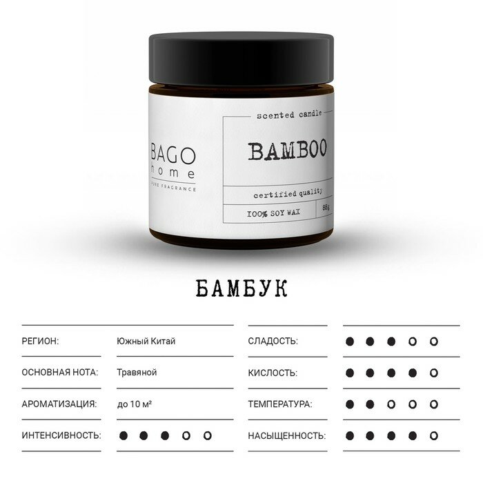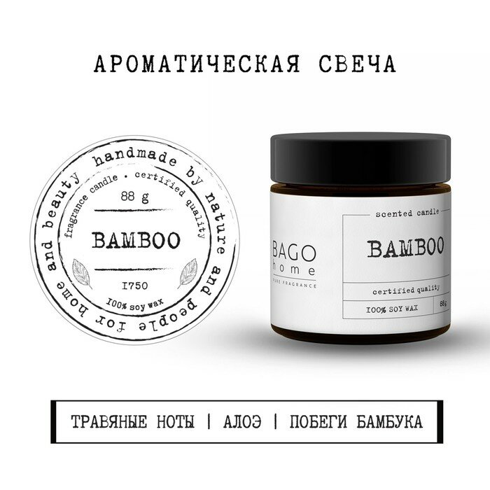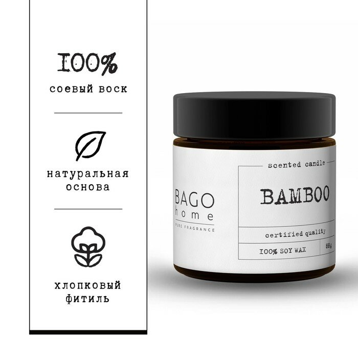 **Ароматическая свеча Bago Home ** — свеча в банке. Предназначена для ароматизации пространства и создания романтической, расслабляющей или праздничной обстановки. Зажженная свеча с ароматом бамбука наполнит помещение изысканным, ненавязчивым благоуханием интерьерного парфюма. Изготовлена в природном стиле. Материал — воск, цвет — коричневый.