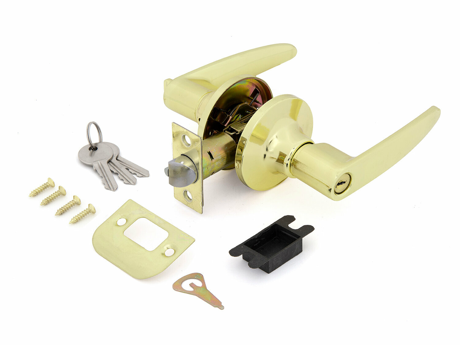 Ручка-защёлка 3502 PB ET – нажимная ручка-защелка с замком с внешней стороны и заверткой с внутренней. Цвет золото, 6 слоев покрытия (включая двойной слой лака). Влагозащита, стойкость к царапинам и истиранию. Ресурс механизма: не менее 200 000 защелкиваний. В комплекте: дверные ручки с фиксатором (2 шт.), защелка, ответная планка, пластиковая вставка под ответную планку, инструментальный ключ, шурупы (4 шт.), стяжные винты (2 шт.).