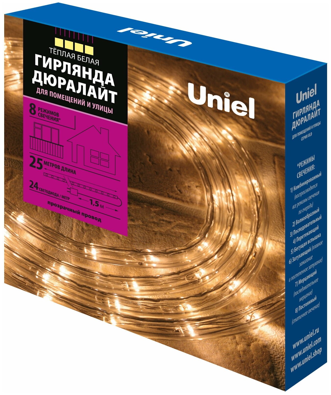 Электрогирлянда универсальная Uniel Дюралайт 25м 24 ламп свет 8 режимов работы ULD-D50 25M/С08 IP44 WARM WHITE