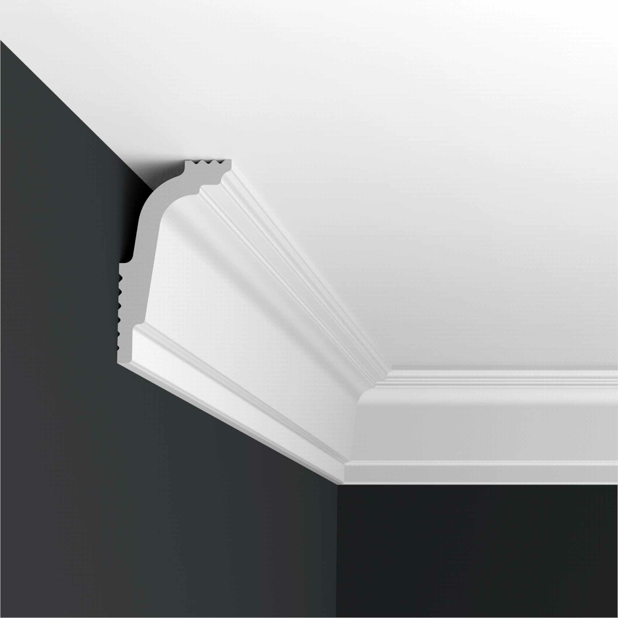 **Плинтус Format ** — накладной декоративный элемент, который закрывает стык стены и потолка, участвует в формировании оригинального интерьера. Изделие выполнено из вспененного композитного полимера, полученного из пенополистирола под высоким давлением. Оно отличается гладкостью, химической нейтральностью и может быть неоднократно окрашено красками на водной базе в любой цвет. Плинтус визуально расширяет пространство.