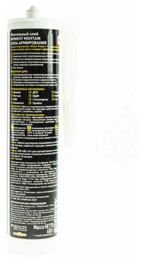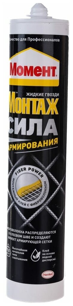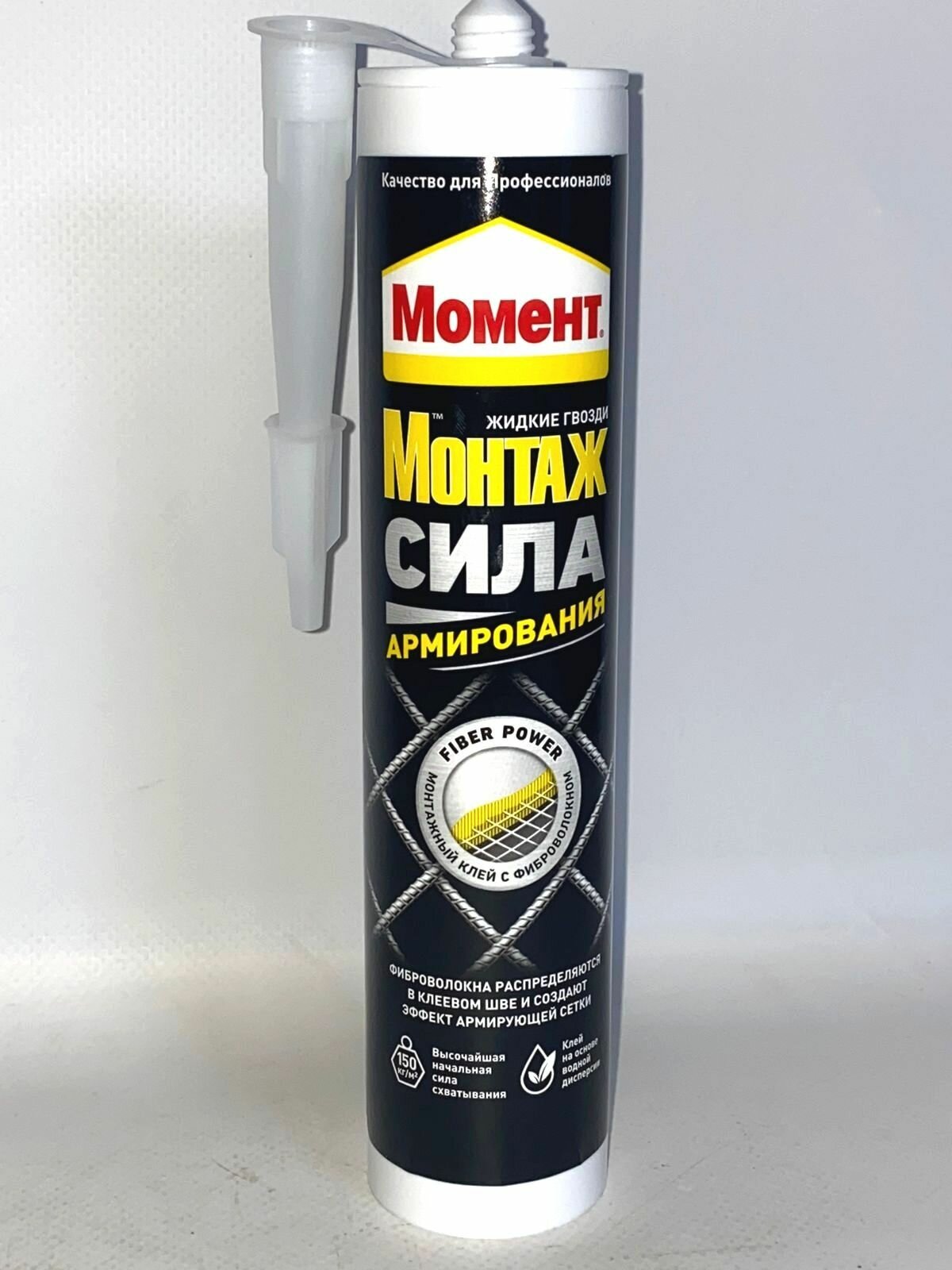 **Клей Момент Монтаж Сила армирования**изготавливается по технологии Fiber Force. Фиброволокна распределяются в полости шва и формируют эффект армирующей сетки. Не предназначен для работы с полиэтиленом, полипропиленом, тефлоном, силиконом, зеркалами. Применяется для монтажа различных элементов дизайна помещений, декоративных деталей, профилей плинтусов и фризов, установки подоконников и дверных коробов, изоляционных и стеновых панелей, соединения листовых материалов между собой.