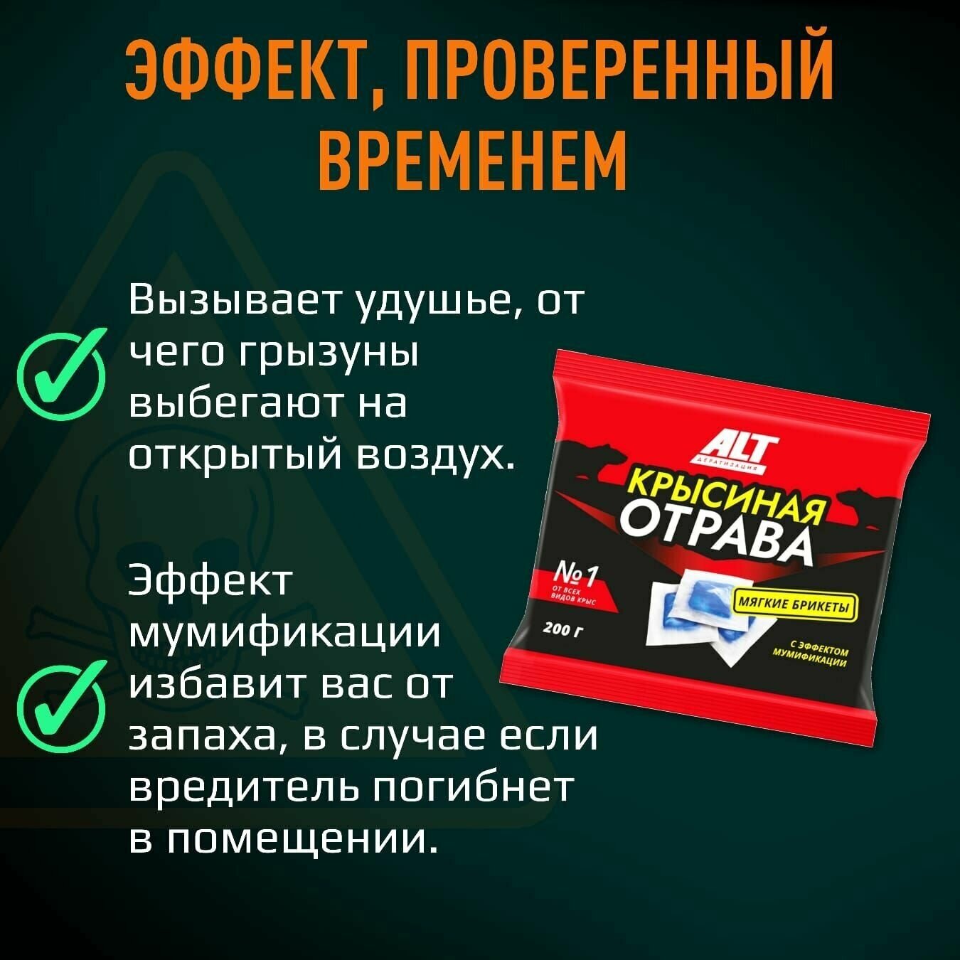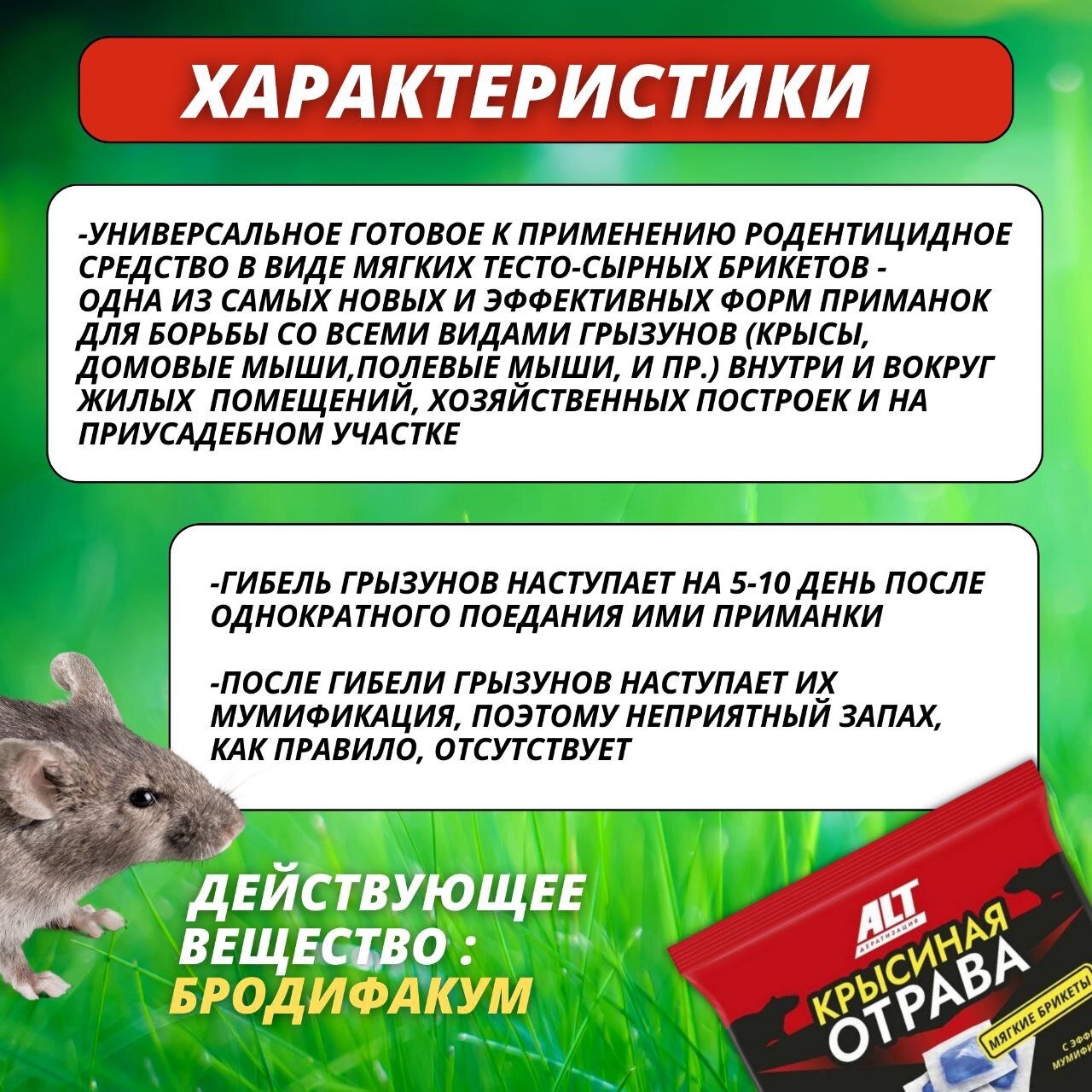 Сильнодействующее вещество, в составе данной отравы Бродифакум способно истребить различные виды грызунов: крыс, мышей, полевок и других мышевидных грызунов приносящих вред как в сельской промышленности, так и в быту.
