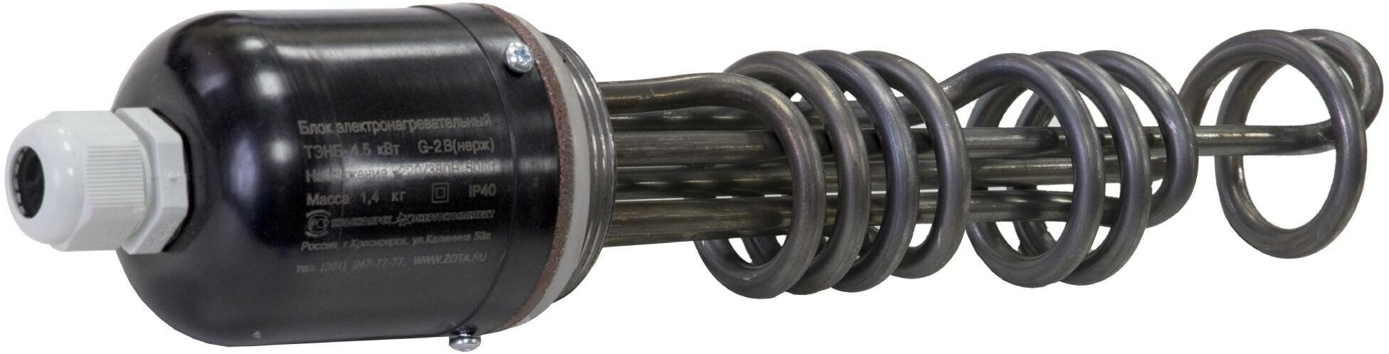Трубчатый электронагревательный блок ZOTA ТЭНБ-9.00 П 2" (d=7,4) п/ф с колпаком - нагревательное устройство для поддержания положительной температуры теплоносителя в котлах отопления ZOTA.В твердотопливных и комбинированных котлах ZOTA, подключение ТЭНБ имеет практичную вспомогательную роль, позволяя котлу сохранять рабочее состояние, когда заканчивается горение твердого топлива.Технические характеристики:- тип: ТЭНБ-9.00;- диаметр: 7,4 мм;- диаметр блока: G 2";- рабочая среда/материал оболочки: П - Вода/Нержавеющая жаростойкая сталь;- мощность: 9,0 кВт;- длина (развернутая): 442 мм;- длина (нагревательного элемента): 380 мм;- вес: 1,7 кг.Расшифровка номенклатуры:ТЭНБ-9.00 П 2" (d=7,4) п/ф с колпаком9.00 - номинальная мощность 9,0 кВтП - материал изготовления - нержавеющая жаростойкая сталь марки 12Х18Н10Т2" - размер присоединения7,4 - диаметр ТЭН 7,4 ммс колпаком - изделие оснащено защитным полимерным колпаком