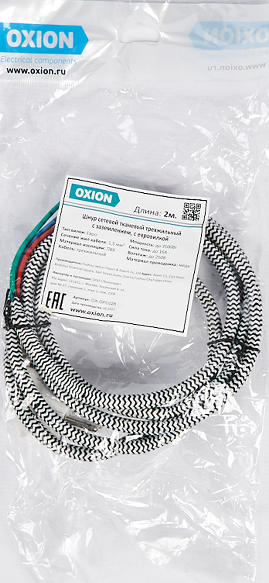 Шнур сетевой Oxion с заземлением 3x1.5 мм 2 м 2 м 16 А цвет серый сетевой шнур с вилкой