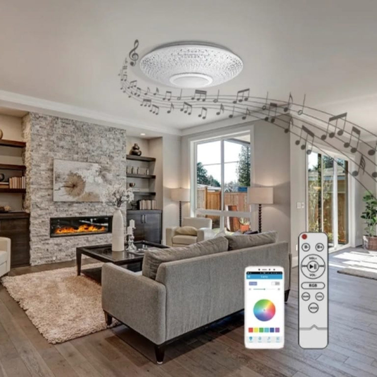 **Светильник Сатори** предназначен для эксплуатации в помещениях с большой площадью — до 48 м². Он подойдет для гостиной жилого дома, коридора или холла гостиницы. С помощью пульта ДУ или со смартфона посредством модуля Bluetooth можно настраивать цвет освещения RGB. Модель сделана из пластика белого цвета. Она легко очищается от пыли влажной тканью и неабразивными средствами бытовой химии.