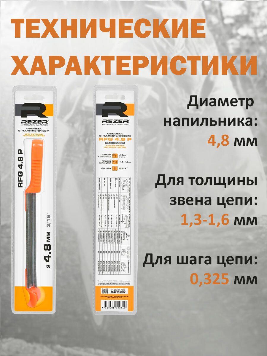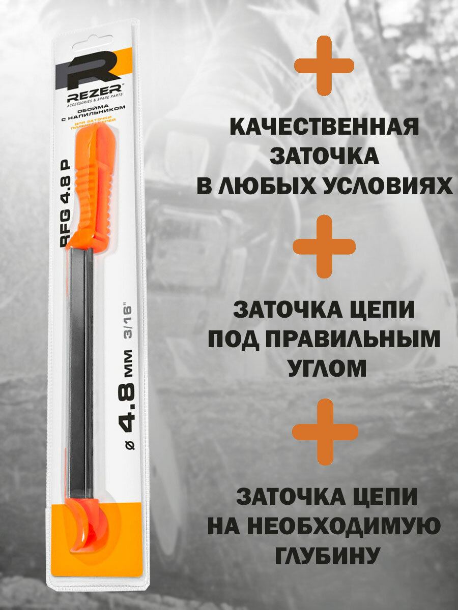 **Напильник и обойма Rezer RFG 4.8 P* используется для восстановления свойств цепей бензиновых пил. Обеспечивает быструю, простую и эффективную заточку под требуемым углом. Возможна эксплуатация для очищения пазов. Эргономичная рукоятка удобно лежит в ладони.