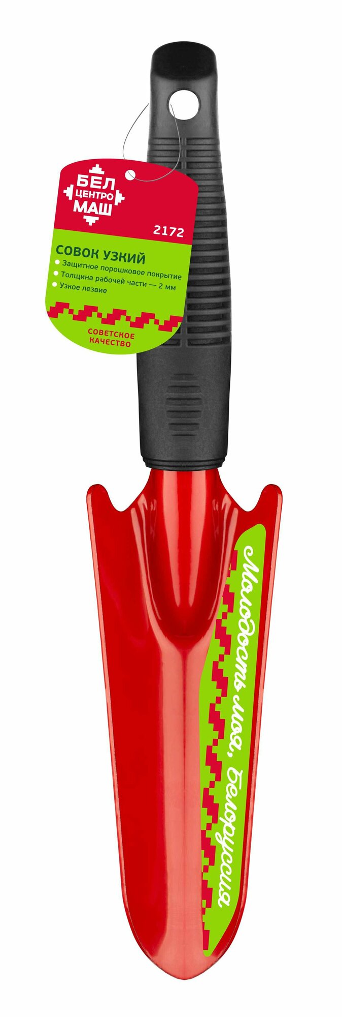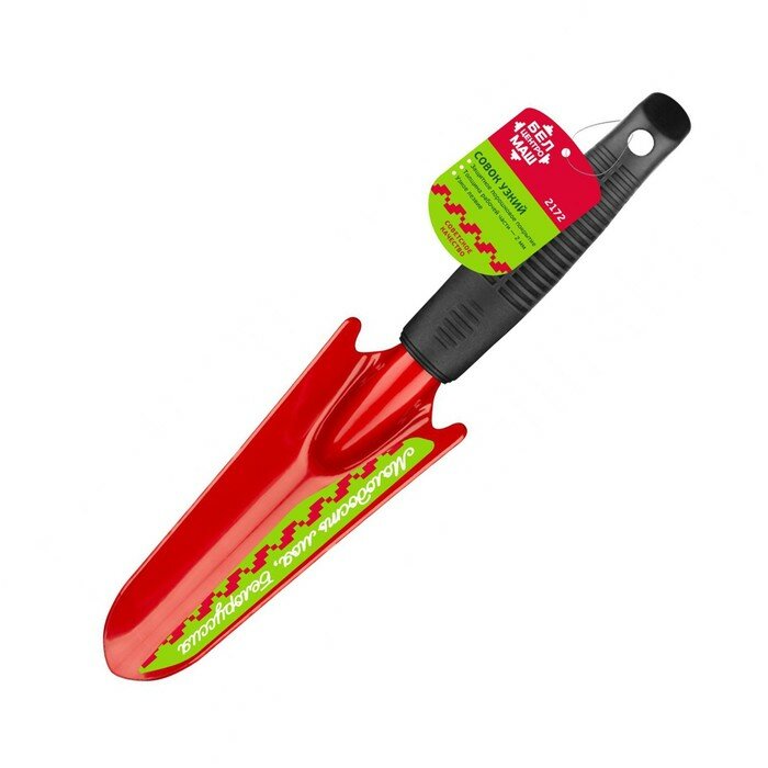 **Совок посадочный узкий БЦМ 2172** — садовый инвентарь, предназначенный для посадочных работ. Используется для выкапывания лунок небольшого размера для цветов, рассады. Может эксплуатироваться в домашних условиях. Легко очищается от грязи и земли под струей воды.