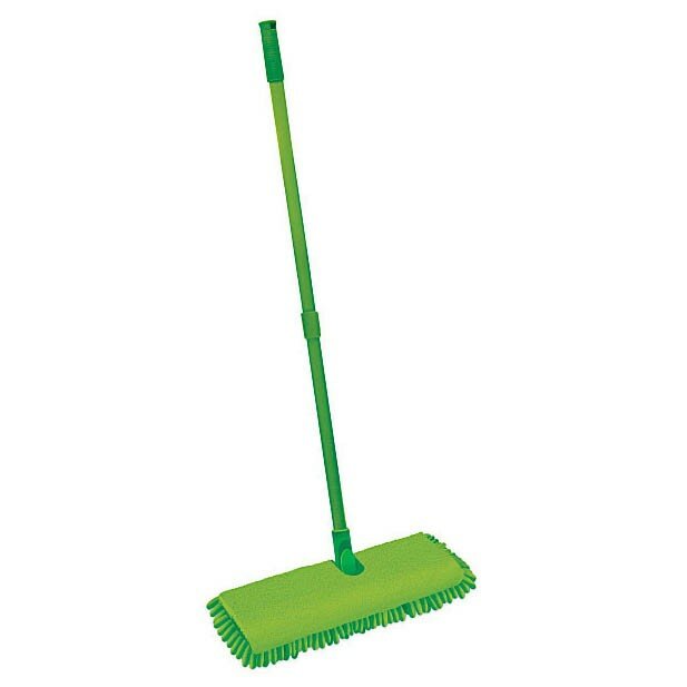 ворсинок. Позволяет сократить время сухой и влажной уборки полов. Прекрасно справляется с уборкой в труднодоступных местах: под шкафами, диванами и т.п.. Швабра с оригинальной двусторонней насадкой из микрофибры и синели удаляет загрязнения с любых напольных покрытий. Используйте любую сторону по