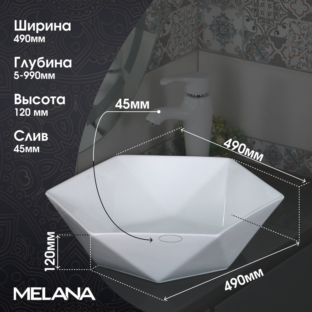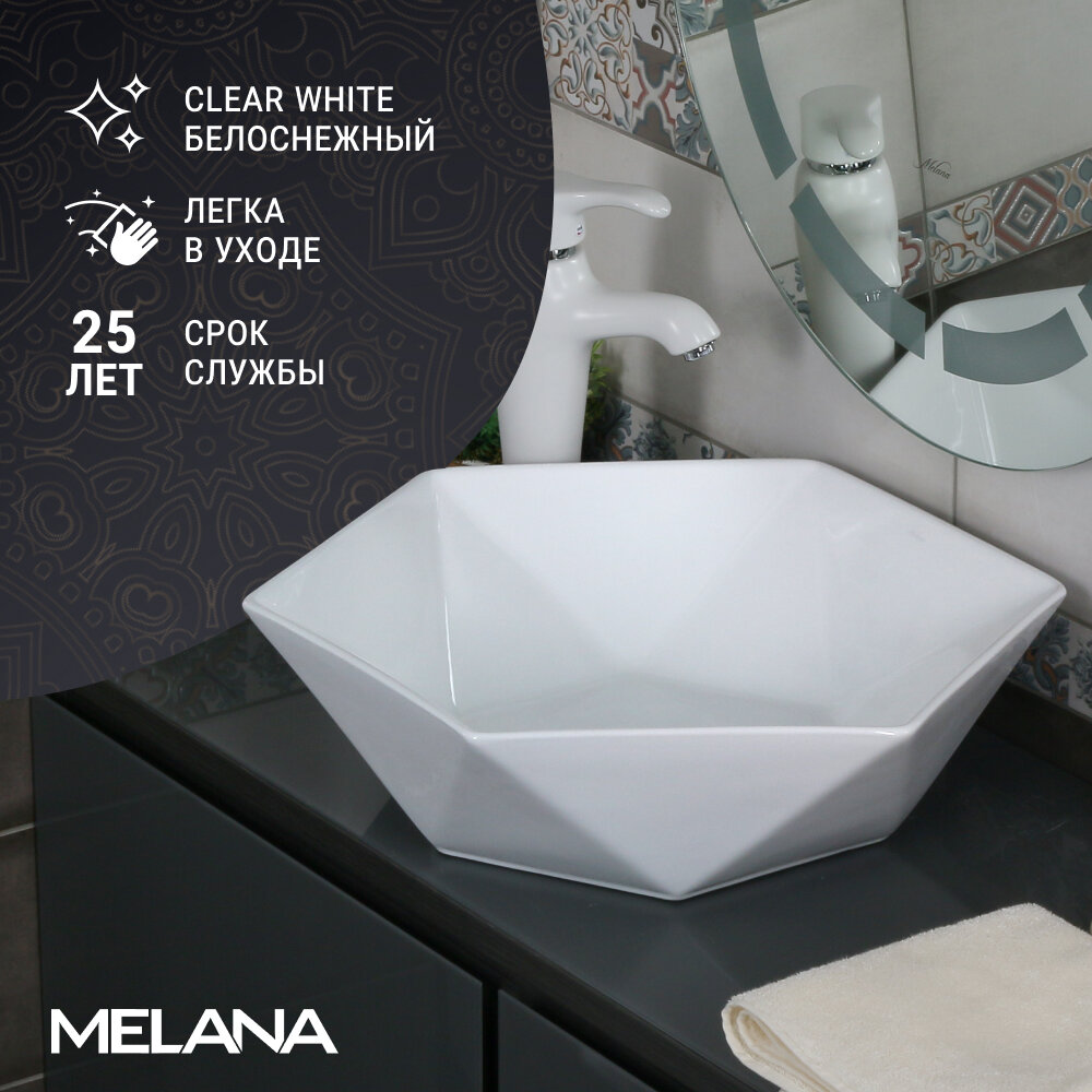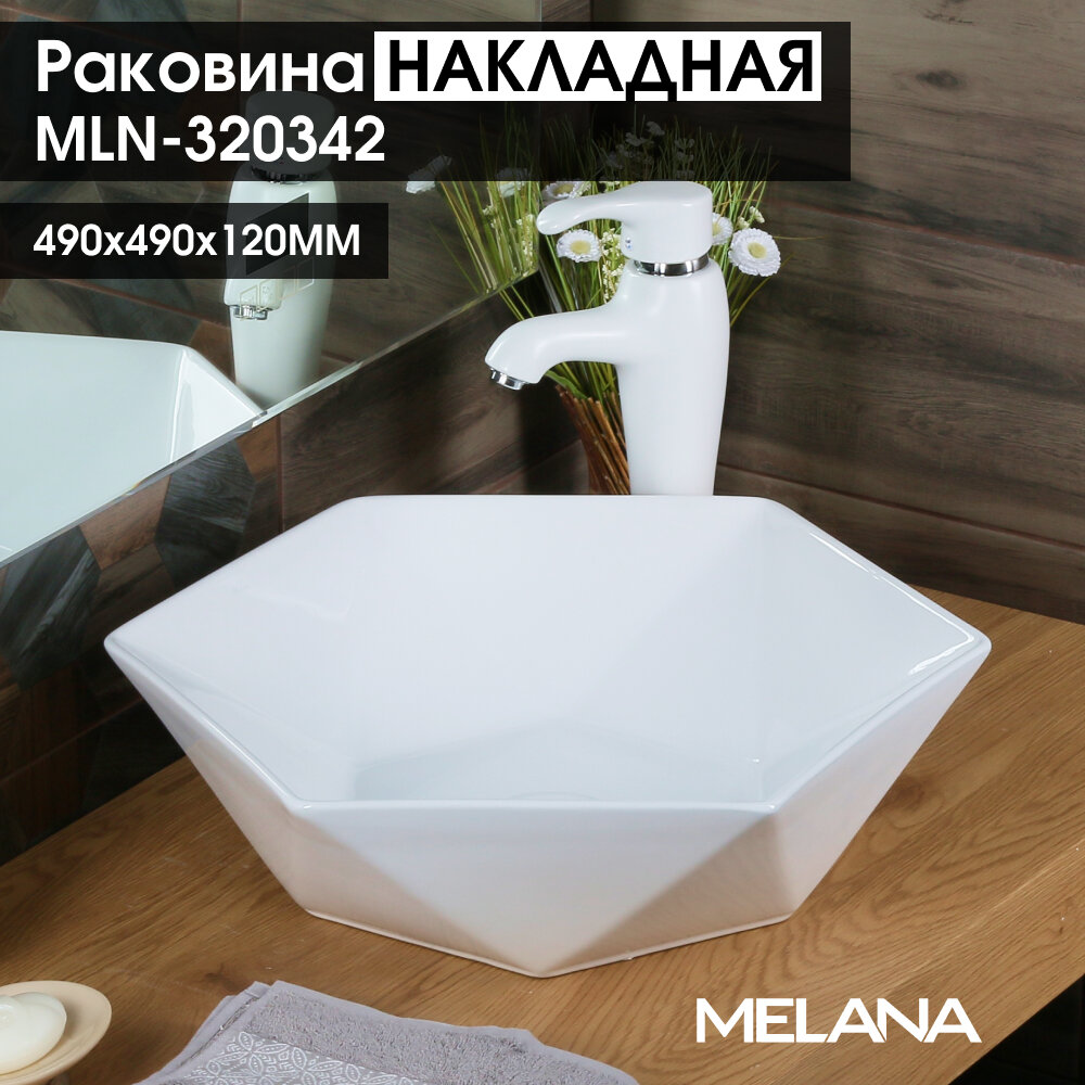 **Раковина Melana MLN-320342** предназначена для эксплуатации в ванной комнате квартиры, загородного дома, отеля. Вид монтажа — накладной. Устанавливается на столешницу. Крепежные элементы не входят в комплект поставки. Для ухода используются влажная ткань и неабразивные чистящие средства. Не оснащена отверстием под смеситель.
