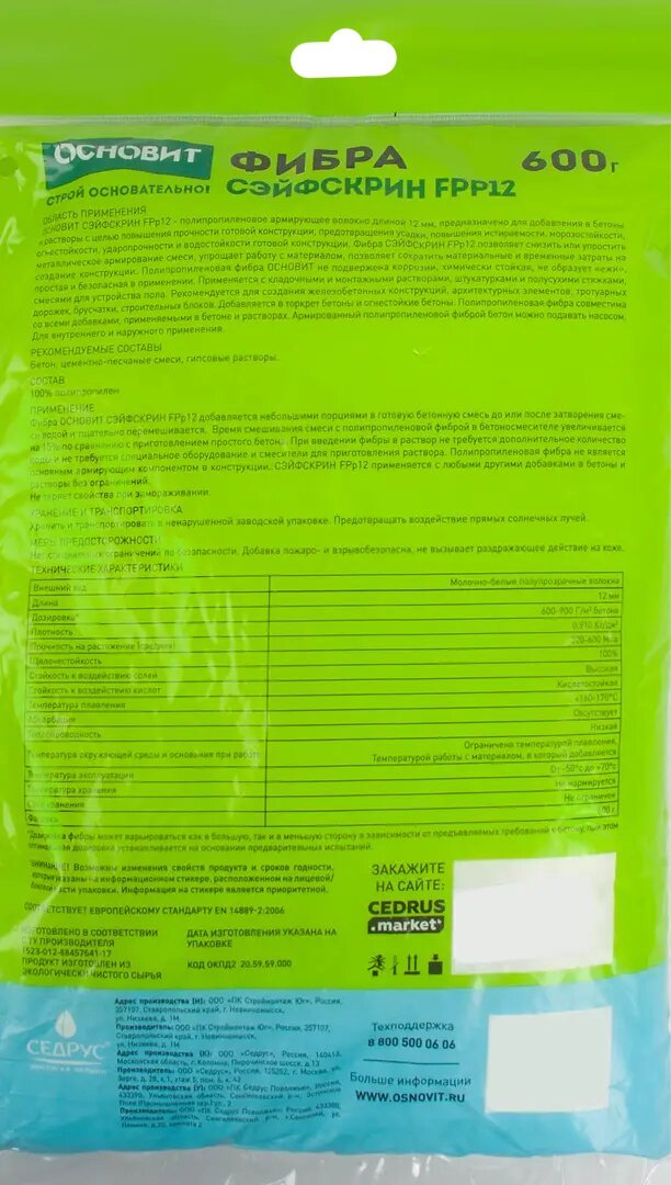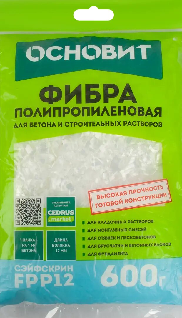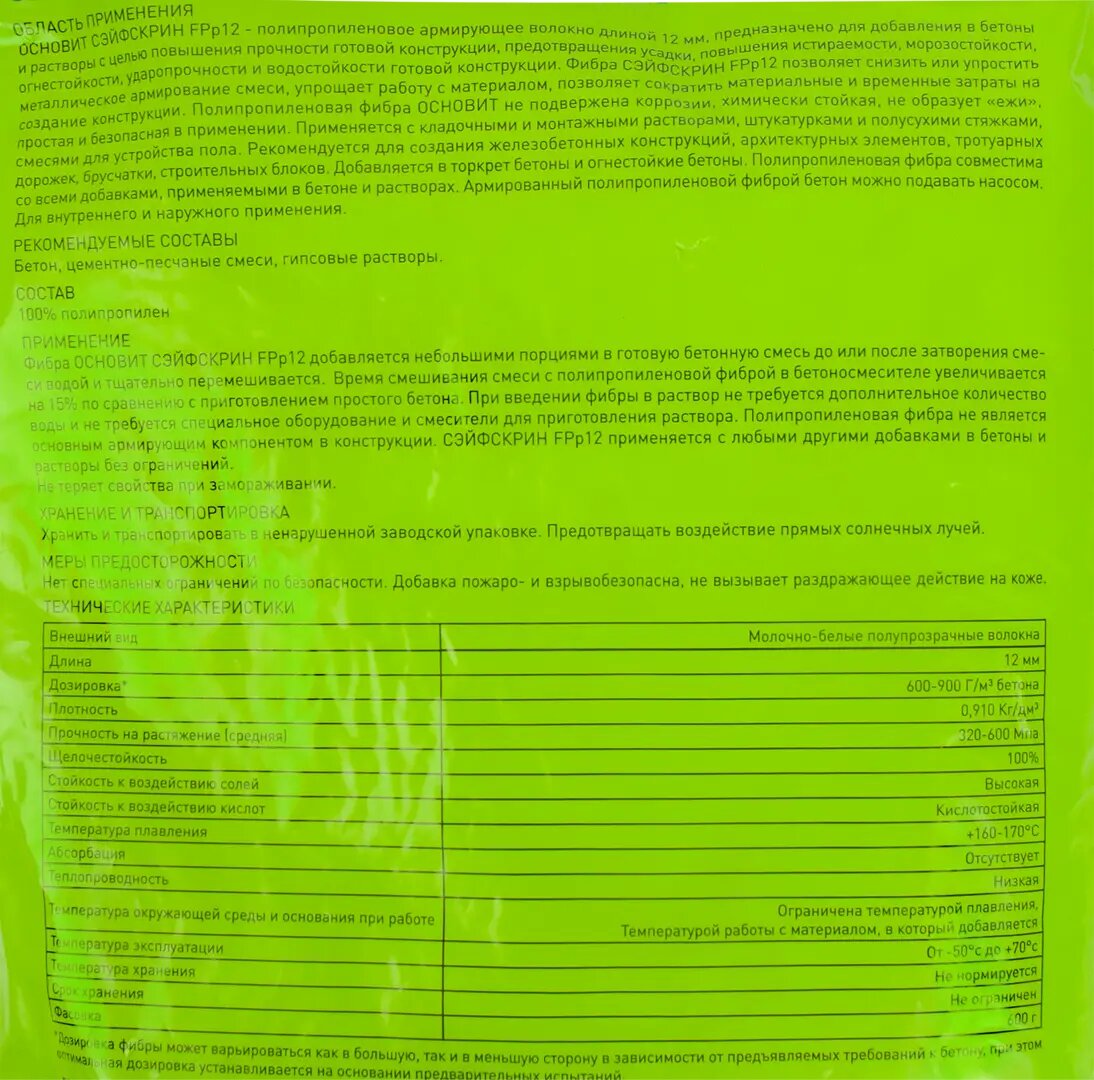 ОСНОВИТ СЭЙФСКРИН FPp12 – полипропиленовое армирующее волокно длиной 12 мм, предназначено для добавления в бетоны и растворы с целью повышения прочности готовой конструкции, предотвращения усадки, повышения стойкости к истиранию, морозостойкости, огнестойкости, ударопрочности и водостойкости готовой конструкции.