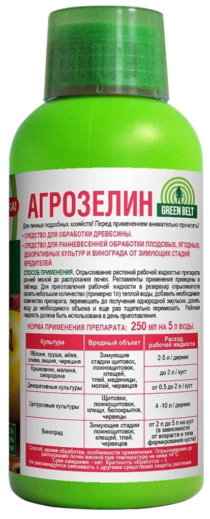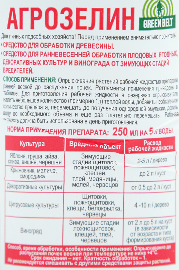 | Инструкция по применению | Опрыскивание растений рабочей жидкостью препарата ранней весной до распускания почек. Регламенты применения приведены в таблице. Для приготовления рабочей жидкости в резервуар опрыскивателя налить небольшое количество (примерно 1 л) теплой воды, добавить необходимое количество препарата, перемешать до получения однородной эмульсии, долить воду до необходимого объема и еще раз тщательно перемешать. Рабочая жидкость должна быть использована в день приготовления. |