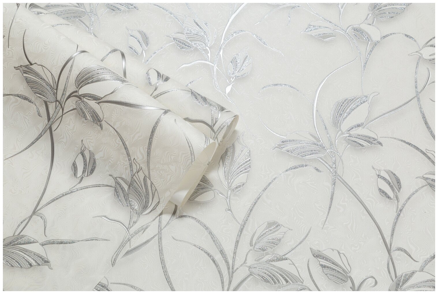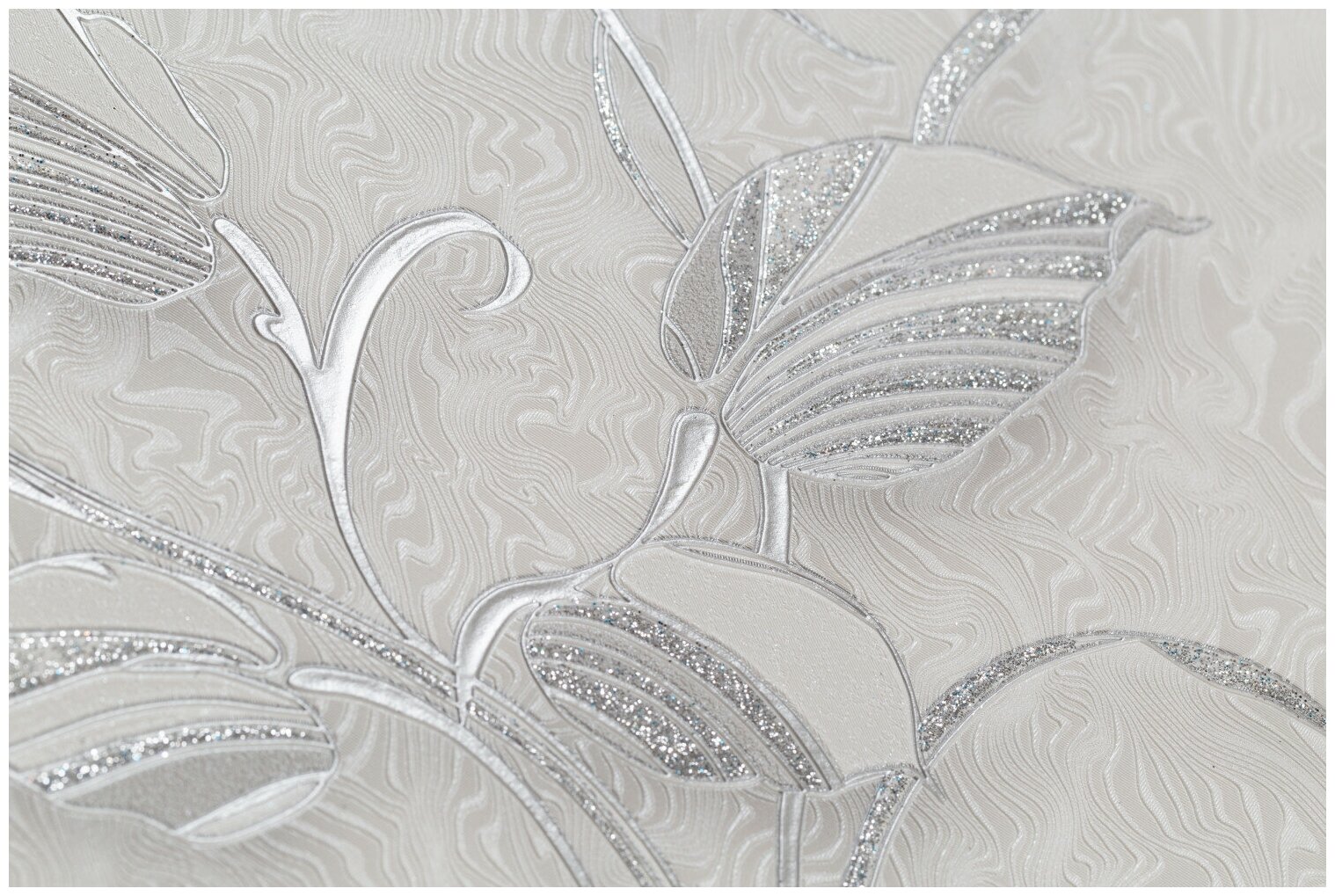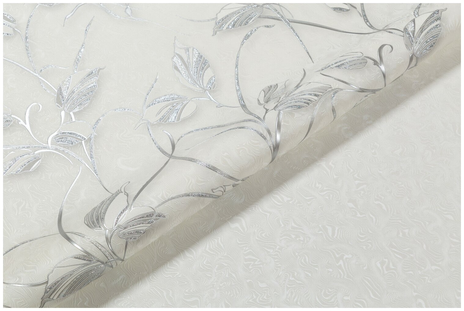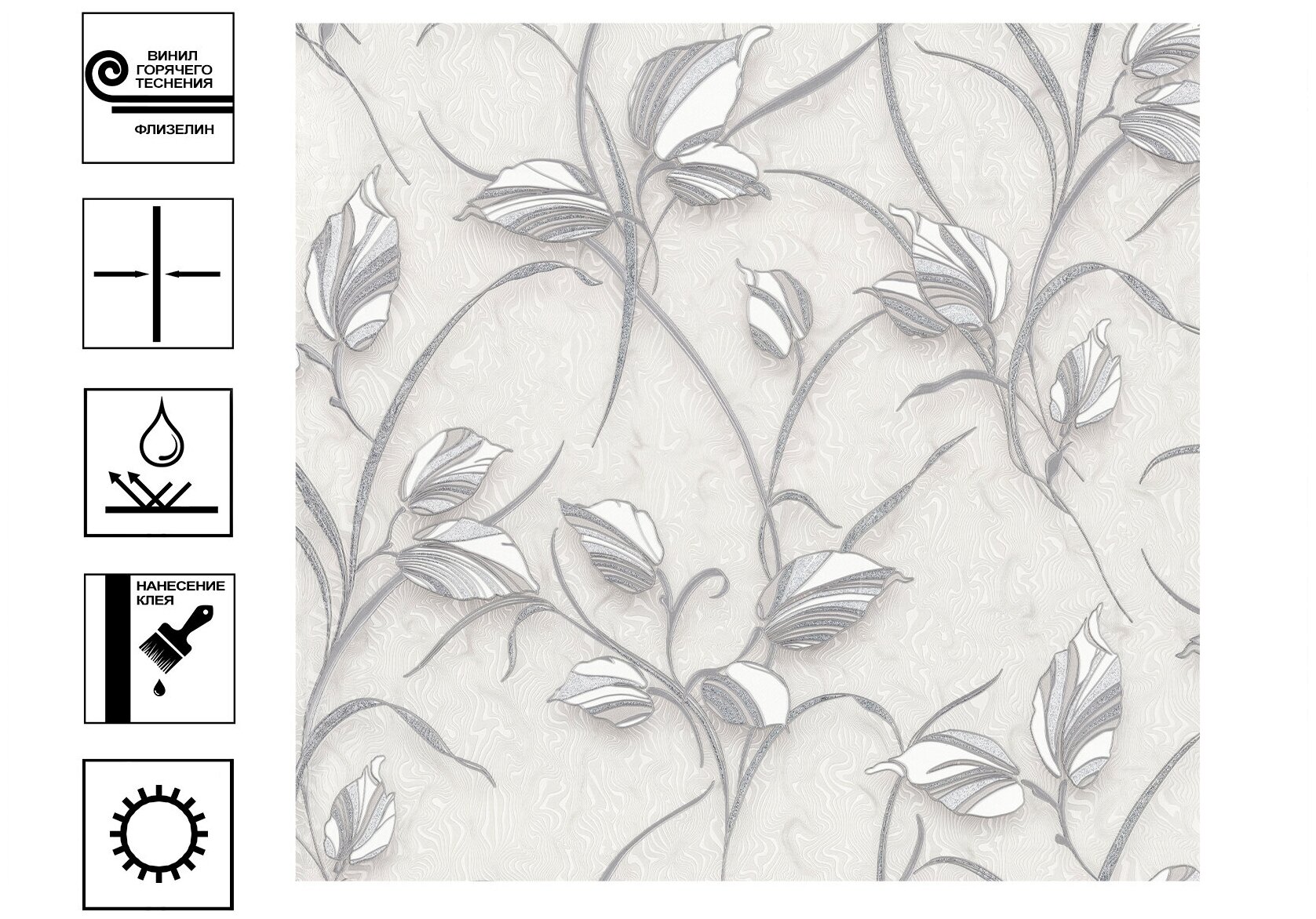 **Обои флизелиновые ** предназначены для финишной отделки стен в жилом помещении и административном учреждении. Легко клеятся встык, образуя единое полотно. Обладают рельефным покрытием с белым рисунком, требующим подбора с шагом раппорта 64 см. Не растягиваются и не рвутся во время монтажа.