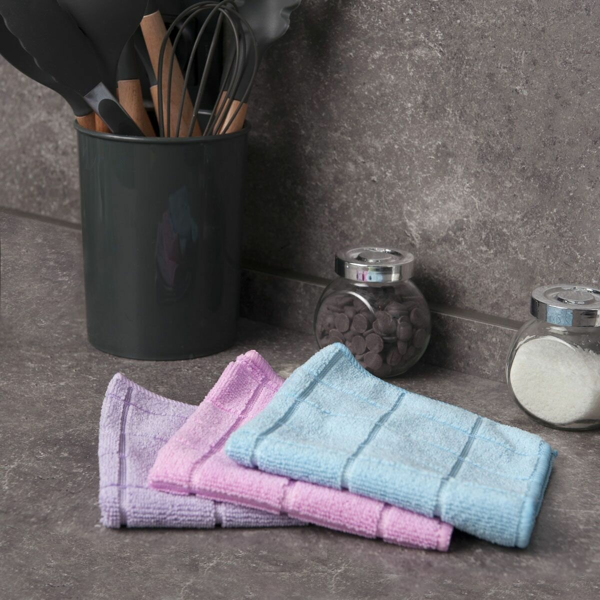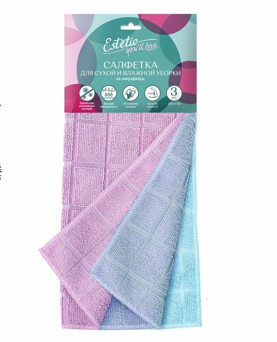 | Инструкция по применению | За счет специальной текстуры «квадраты» и дорожек между ними салфетка быстро высыхает. Это препятствует размножению бактерий внутри волокна. Высокая впитываемость влаги обеспечивается повышенной плотностью микроволокна. Наличие в составе микрофибры полиамида делает ее более износостойкой и пластичной. Салфетки не оставляют разводов и ворсинок. 3 разных цвета позволяют без труда идентифицировать 3 зоны уборки (комната, кухня, санузел) для избегания перекрестного загрязнения. Подходит для: Влажной уборки, Сухой уборки, Полировки. Можно протирать любые поверхности. |