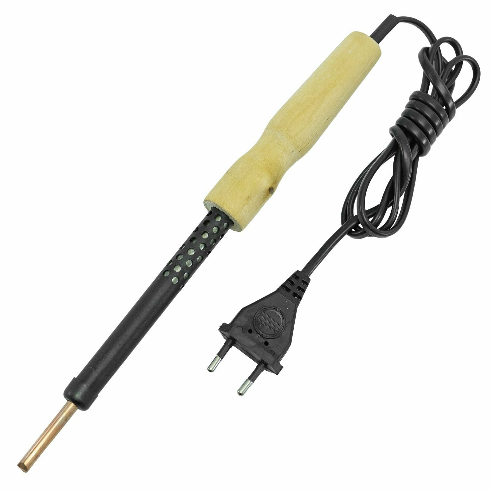 **Паяльник с деревянной рукояткой** является прибором непрерывного нагрева, не имеющим регулятора мощности. Его используют радиолюбители и профессиональные электрики при широком профиле работ по пайке, лужению, ремонту тонких плат и микросхем. Время нагрева — 8 мин до рабочей температуры в 400°C.