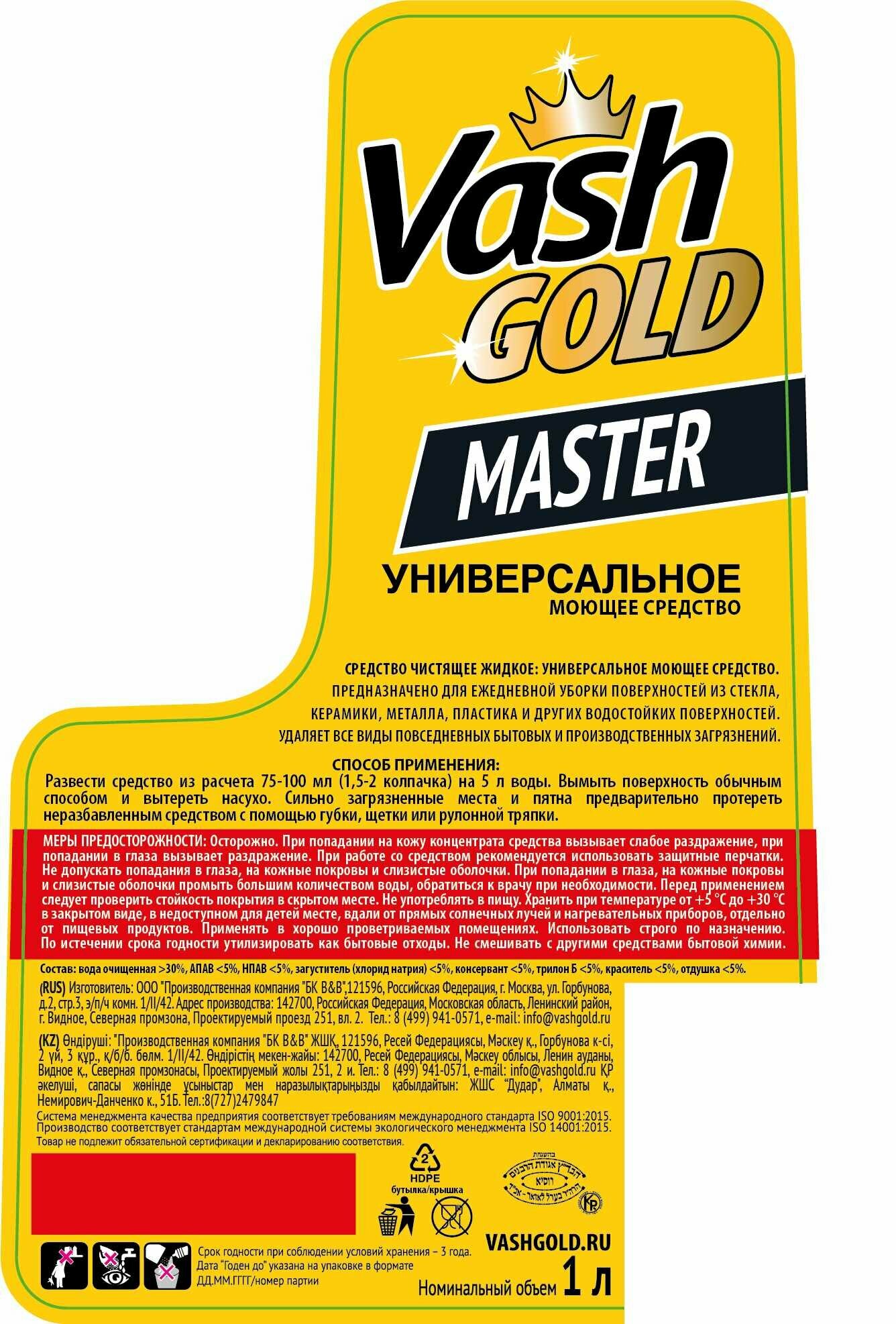 **Универсальное моющее средство Vash Gold** — жидкий состав в формате готового раствора. Активная формула эффективна на любых поверхностей — из стекла, металла, пластика, керамики и других водостойких материалов. Средство удаляет любые загрязнения и не оставляет после себя разводов.