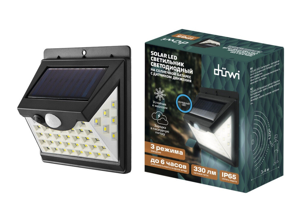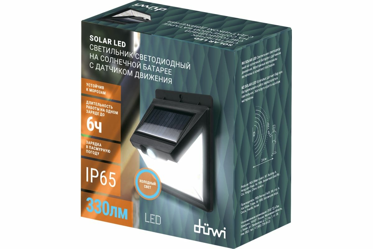**Уличный настенный светильник duwi Solar** предназначен для подсветки зданий и сооружений в ночное время. Включение фонаря происходит автоматически в тёмное время суток при движении в зоне действия датчика. Светодиодный светильник работает на солнечной батарее. Получаемого в течение светового дня заряда хватает на 6 часов непрерывной работы.