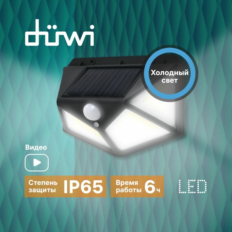 **Уличный настенный светильник duwi Solar** предназначен для подсветки зданий и сооружений в ночное время. Включение фонаря происходит автоматически в тёмное время суток при движении в зоне действия датчика. Светодиодный светильник работает на солнечной батарее. Получаемого в течение светового дня заряда хватает на 6 часов непрерывной работы.