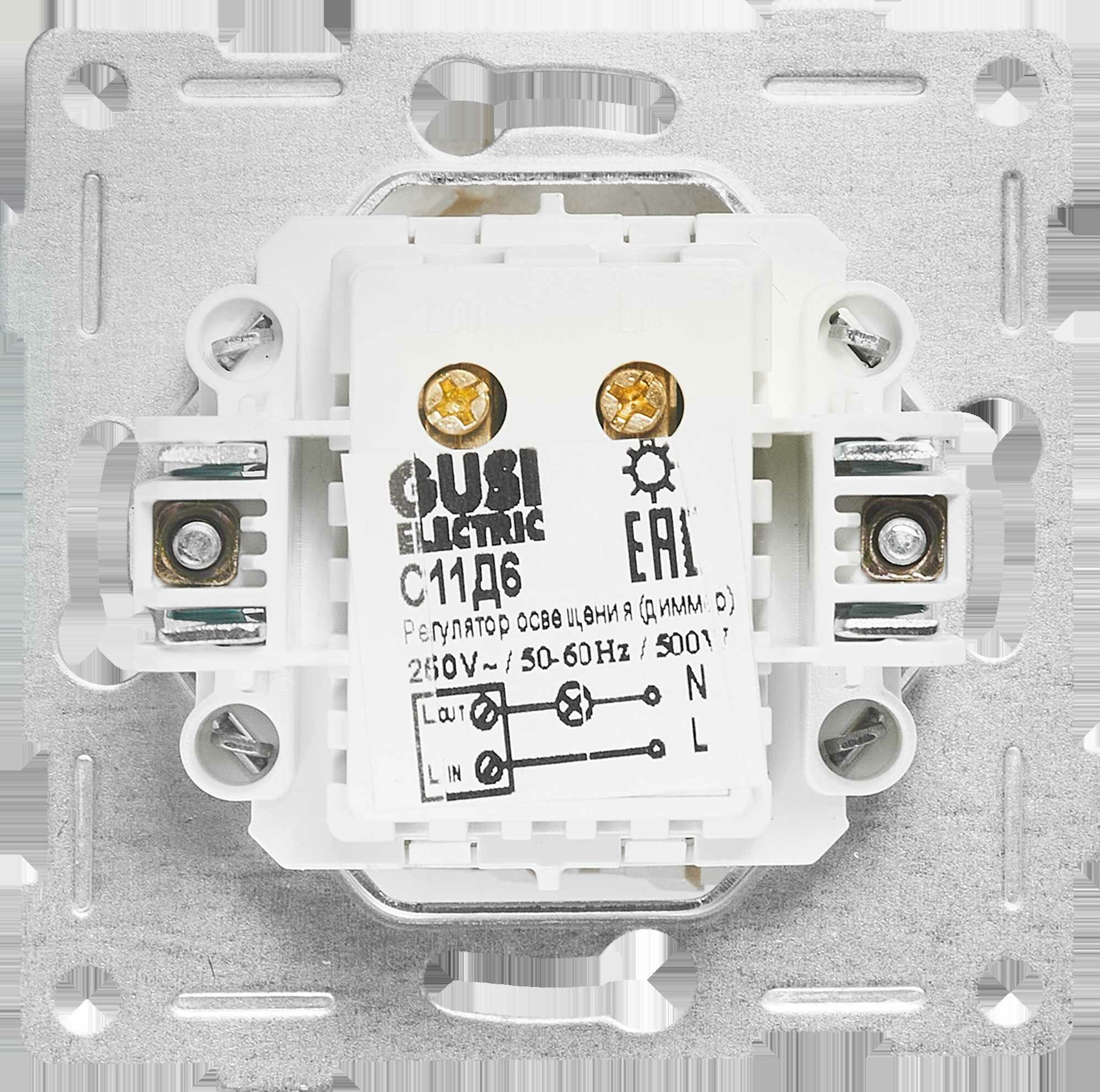 **Диммер встраиваемый Gusi Electric** предназначен для плавной регулировки освещения. Совместим с электропроводкой из меди или алюминиевого сплава 8 серии. Встраивается в монтажную коробку или полость. Монтировать можно как на распорные лапки, так и на винты (резьба М3.5). Корпус изготовлен из негорючего пластика, контакты из биметалла. Цвет корпуса — жемчуг.