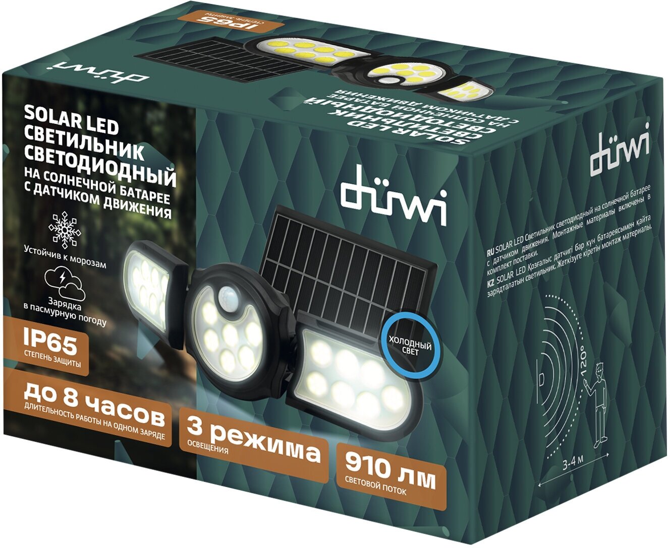 **Уличный настенный светильник duwi Solar** предназначен для подсветки зданий и сооружений в ночное время. Включение фонаря происходит автоматически в тёмное время суток при движении в зоне действия датчика. Светодиодный светильник работает на солнечной батарее. Получаемого в течение светового дня заряда хватает на 8 часов непрерывной работы.