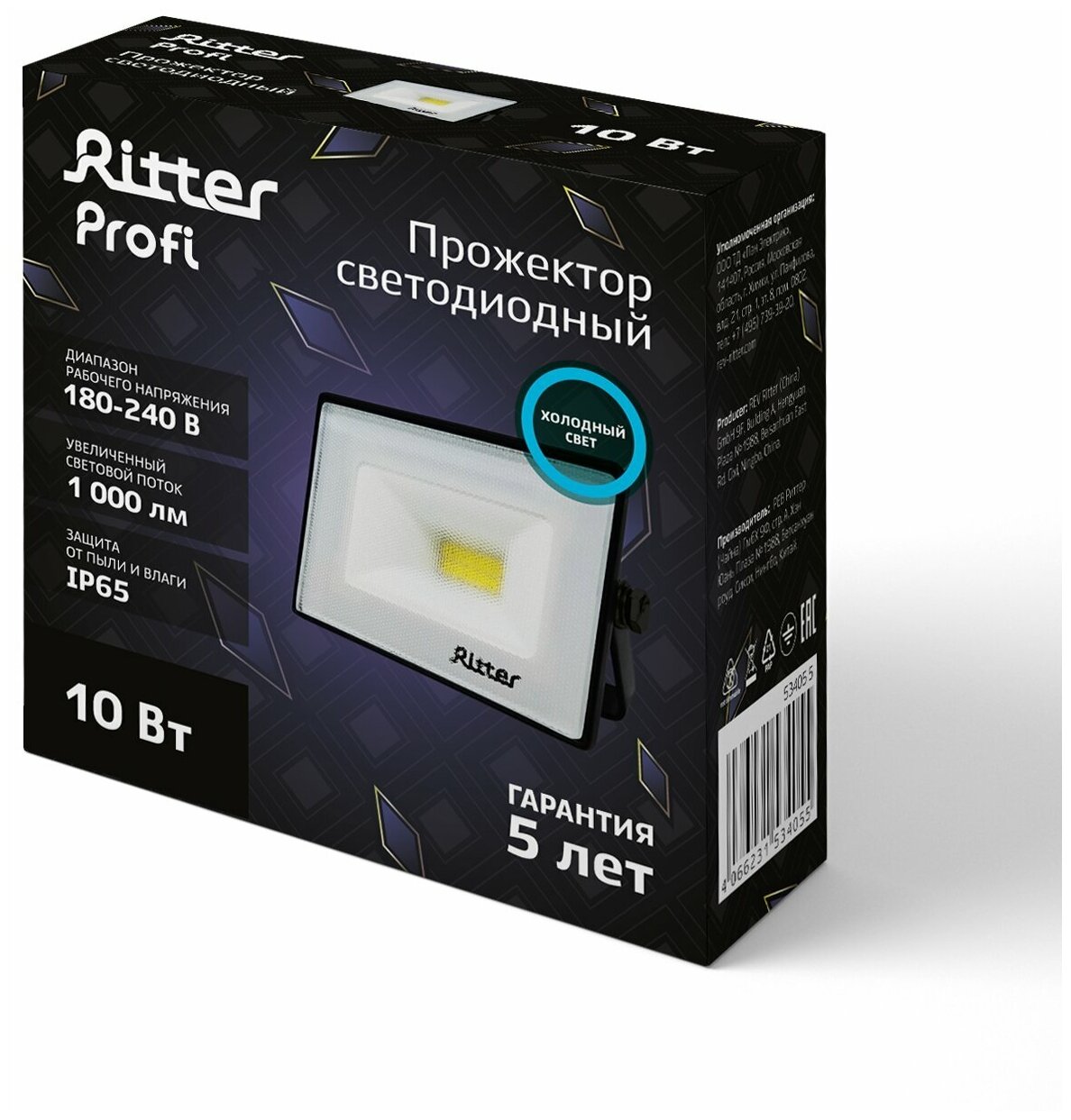 На сегодняшний день товар «Прожектор светодиодный уличный Ritter Profi 10 Вт 1000 Лм 180-240В холодный белый свет 6500К IP65 черный 53405 5» можно купить с кешбеком в 1 магазине: Яндекс.Маркет