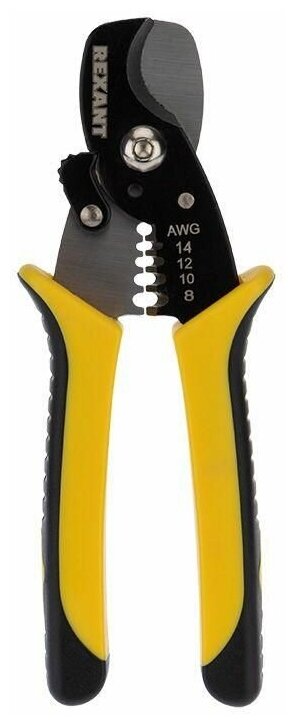 **Кабелерез Rexant 11 мм, 160 мм**. Инструмент 2 в 1 (стрипер и ножницы) предназначен для разрезания медных и алюминиевых одно- и многожильных проводов, а также для удаления изоляции (не подходит для стальной проволоки и проволочных канатов).