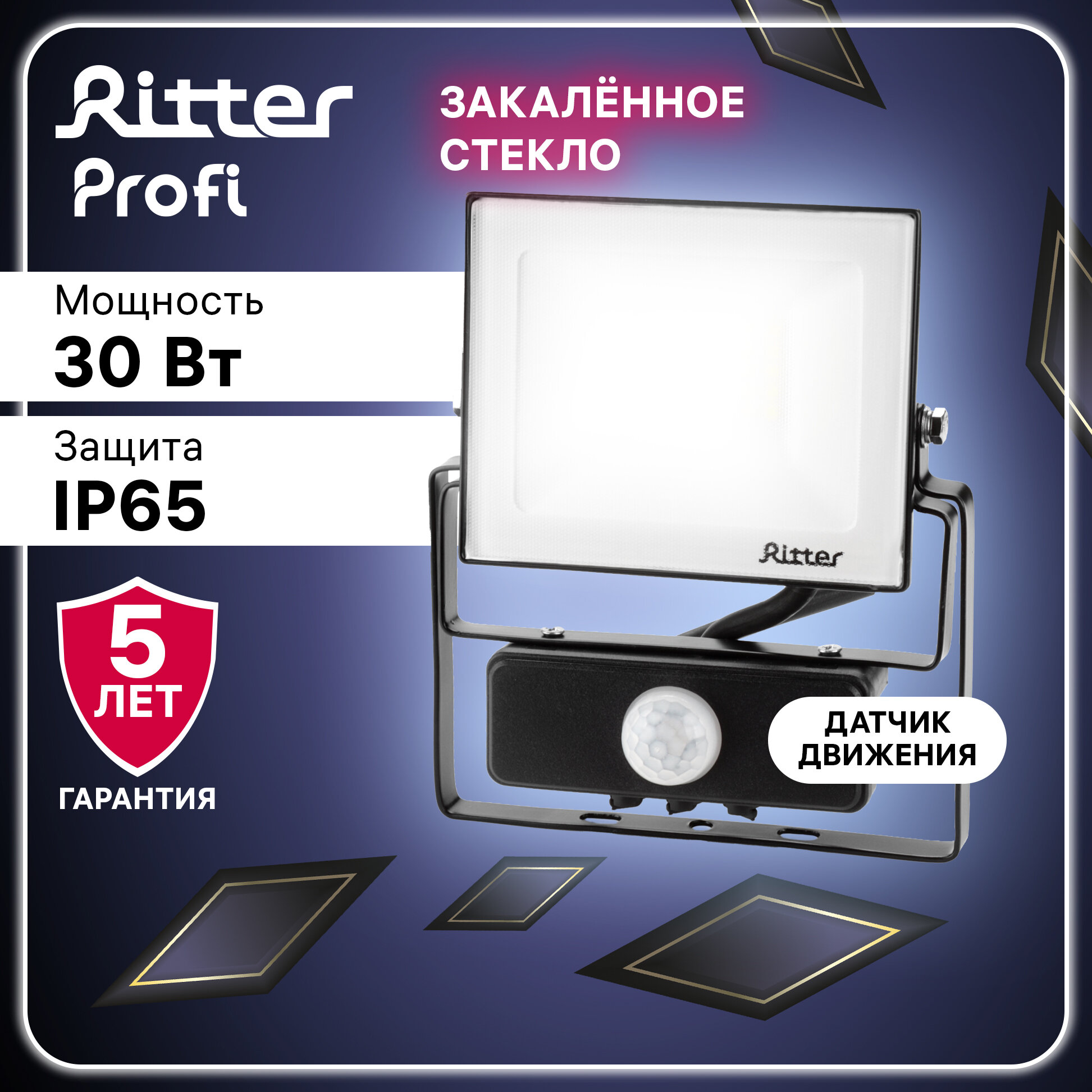 Светодиодные прожекторы бренда Ritter серии PROFI предназначены для общего и акцентного освещения больших открытых территорий, домов, зданий, сооружений и промышленных объектов. Прожекторы серии PROFI не теряют своей эффективности при снижении напряжения в сети до 180 В, а использование новейших светодиодных технологий позволяет получить мощный светодиодный поток при низком потреблении электроэнергии. Прочный алюминиевый корпус и закаленное стекло защищают прожектор от неблагоприятных погодных условий и при этом обладают высокими теплопроводными характеристиками. Прожекторы серии PROFI оснащены датчиками движения с возможностью регулировки чувствительности и времени отключения, что позволит настроить комфортный уровень работы прожектора.Особенности- Мощность - 30 Вт.- Световой поток - 3000 Лм.- Площадь освещения до 40 м2.- Цветовая температура - 6500 К, холодный свет.- Диапазон рабочего напряжения - 180-240В, 50 Гц.- Степень защиты - IP65.- Угол рассеивания - 120 градусов.- Температура эксплуатации - от -40С до +45С.- Сечение провода - 3х0,75 мм2.- Тип датчика - инфракрасный.- Угол охвата зоны датчика движения - 120 градусов.- Диапазон дальности обнаружения - 4-10 м (регулируется).- Время задержки отключения - 8-10 мин (регулируется).- Диапазон освещенности - 2-2000 лк (регулируется).- Цвет корпуса - черный.- Материал корпуса - алюминий.- Материал рассеивателя - закаленное матовое стекло.- Размеры - 160х132х40 мм.- Гарантия - 5 лет.Преимущества- Датчик движения с регулировками: уровня освещенности, дальности и времени срабатывания, что позволяет максимально точно адаптировать прожектор под необходимые условия работы.- Благодаря рассеивателю дает комфортный свет для глаз.- Повышенный световой поток с отдачей 100 Лм/Вт.- Идеален для работы в местах с пониженным напряжением сети от 180 В.- Отлично подходит для складов, пандусов, цехов, парковок, строительных объектов и мест с большим количеством деревьев.- Увеличенный срок службы до 50000 часов.
