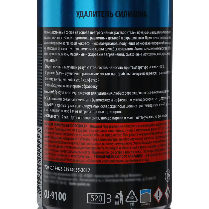 **Удалитель силикона KU-9100** является обезжиривающим аэрозольным средством. Состав на базе неагрессивных растворителей предназначен для очистки поверхностей при их подготовке к окрашиванию. Применение средства позволяет улучшить адгезивные свойства краски и лакокрасочных материалов.