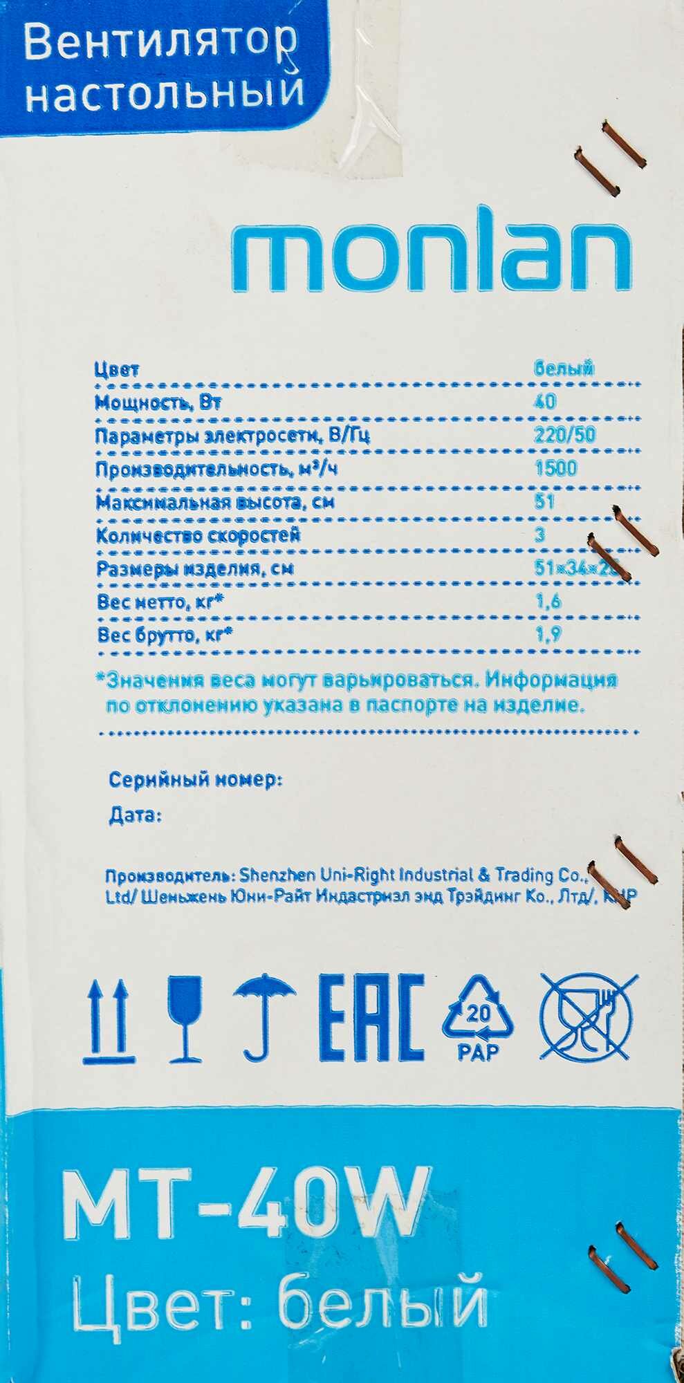 Вентилятор напольный Monlan 40 Вт 34 см цвет белый MT-40W