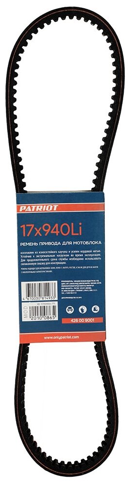 **Ремень PATRIOT 17X940Li** предназначен для установки на мотоблок «Самара». Используется для передачи крутящего момента с двигателя на ведомый вал. За счет полученного импульса мотоблок начинает движение.
