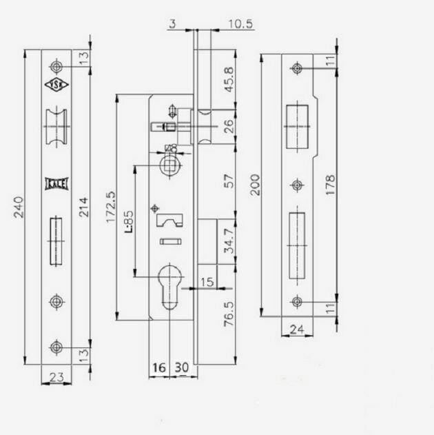 **Замок Kale 153-85BS30-23NP-STB** – универсальный врезной замок под цилиндр. Подходит для установки на металлические и деревянные двери. Оснащен поворотной защелкой и зубчатыми ключами. Усиленная конструкция замка обеспечивают надежное запирание.