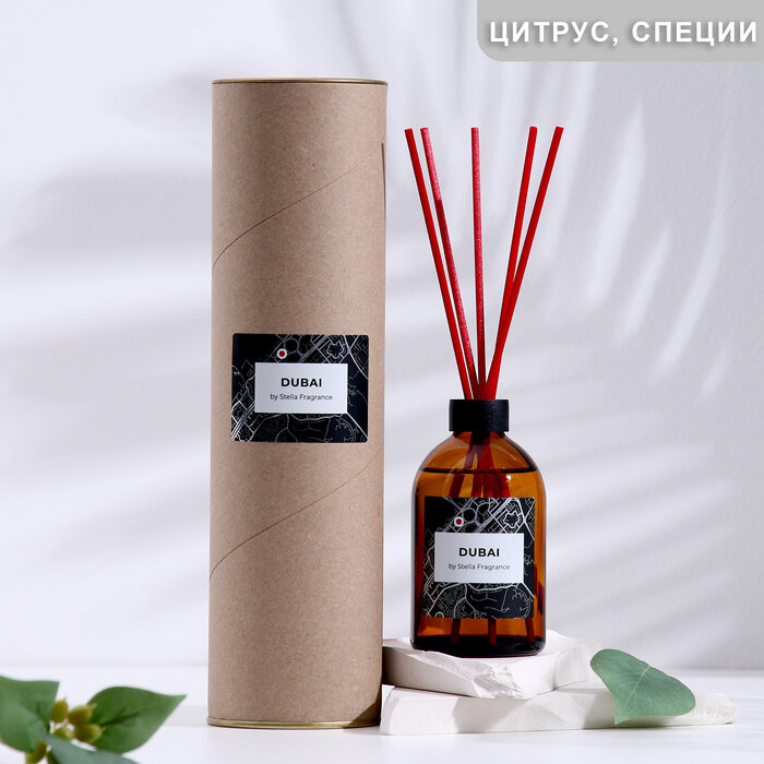 **Диффузор ароматический STELLA FRAGRANCE Dubai** обладает легким ненавязчивым ароматом. Это актуальная альтернатива освежителю воздуха. Состоит из стеклянного флакона, заполненного жидкостью, приготовленной на основе натуральных эфирных масел, и фиброволоконных палочек, которые служат распространителями аромата. Для активации диффузора нужно снять с флакона крышку, удалить пробку и разместить внутри емкости палочки.