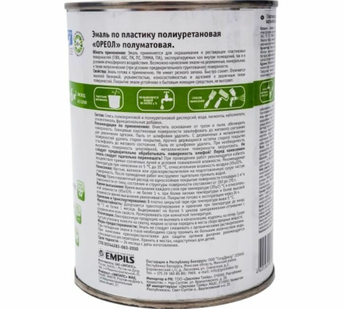 **Эмаль по пластику Ореол полуматовая** - полиуретановый акриловый состав, предназначенный для окрашивания и реставрации поверхностей из пластика (ПВХ, ПА, ПК, ПС и других). Может применяться как внутри, так и снаружи помещения. Подходит для нанесения на минеральные, деревянные и металлические поверхности - в последнем случае требуется предварительное грунтование. Эмаль такого типа легко наносится и быстро сохнет. Характеризуется высокой износостойкостью, укрывистостью и белизной. Готовое покрытие не выгорает под солнечными лучами и имеет хорошую устойчивость к бытовым моющим средствам. Перед применением необходимо тщательно перемешать. Можно разбавить водой, но не более 5% от массы. Основание следует очистить от грязи, пыли, а также обезжирить. Если пластиковая поверхность глянцевая, то ее нужно зашлифовать до матового состояния - поможет улучшить адгезию. Наносить при температуре от +5°C до +35°C.