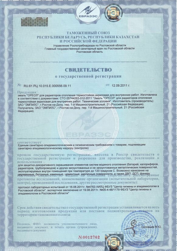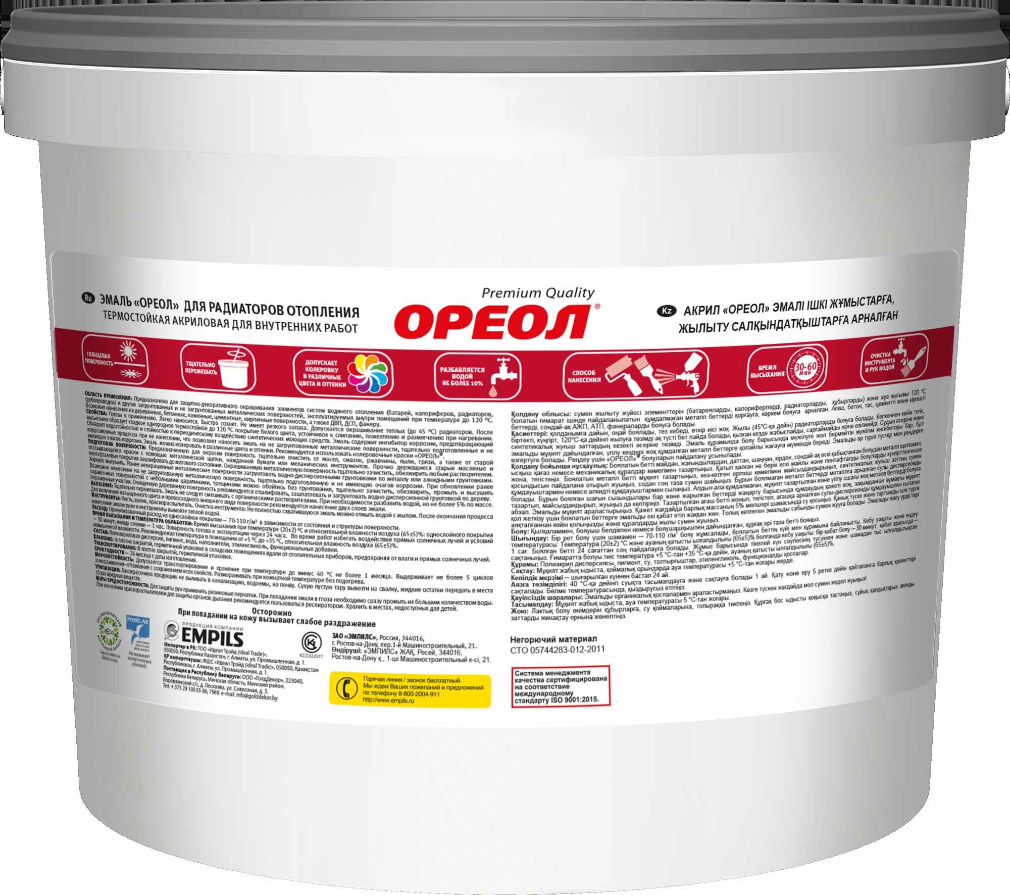 **Эмаль акриловая Ореол** предназначена для создания защитно-декоративного окрашивания элементов систем отопления. Используется внутри помещения. Также подходит для нанесения на загрунтованные и металлические поверхности, а также основания из дерева, бетона, камня, кирпича, ДВП и некоторых других материалов. Продукт готов к применению - легко наносится и равномерно распределяется. После высыхания формирует гладкое и однородное глянцевое покрытие белого цвета, отличающегося высокой термостойкостью - до 120°C. В составе есть ингибитор коррозии, который предотвращает коррозионные процессы при нанесении эмали. Возможна колеровка в разные цвета и оттенки. Перед нанесением нужно очистить основание от пыли и грязи, а также ржавчины и старого отслаивающегося покрытия. Продукт не следует смешивать с органическими растворителями - можно разбавить водой, но не больше 5% по массе.