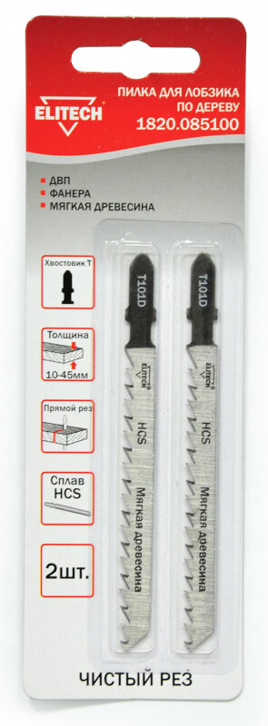 **Пилка Elitech T101D** с Т-образным хвостовиком предназначена для оснащения электрического лобзика. Инструмент позволяет распиливать детали из древесины твердых пород, ДСП и МДФ. Зубья формируют ровный прямой рез, не крошат края и не образуют зазубрин.