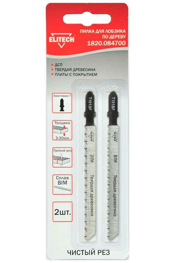 **Пилка Elitech T101BF** с Т-образным хвостовиком предназначена для оснащения электрического лобзика. Инструмент позволяет распиливать детали из древесины твердых пород, ДСП и МДФ. Конусообразные зубья формируют ровный прямой рез, не крошат края и не образуют зазубрин.